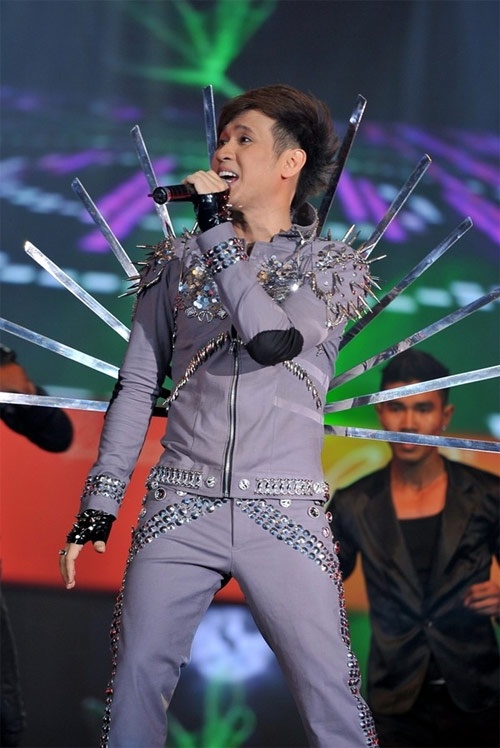 | Nguyên Vũ và bộ đồ diễn lóng lánh cầu kỳ. |