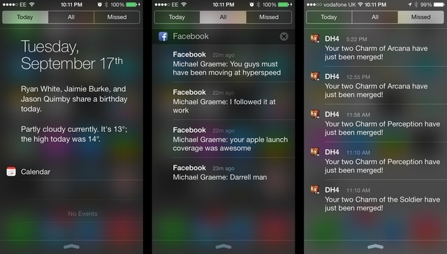 Bên cạnh thay đổi về phần nhắn tin, thanh thông báo Notification Center của iOS 8 cũng sẽ được đơn giản hóa đi chút ít bằng việc loại bỏ các thẻ “Today”, “All” và “Missed”. Thay vào đó, toàn bộ các thông báo sẽ được gộp chung thành một bảng hoặc được hiển thị bằng một cách nào khác hợp lý hơn. Theo dự kiến, Apple sẽ có thể cải tiến các tính năng cho phép kết hợp nhiều thông báo với nhau, tuy nhiên hiện vẫn chưa có lời xác thực nào được đưa ra chính thức.