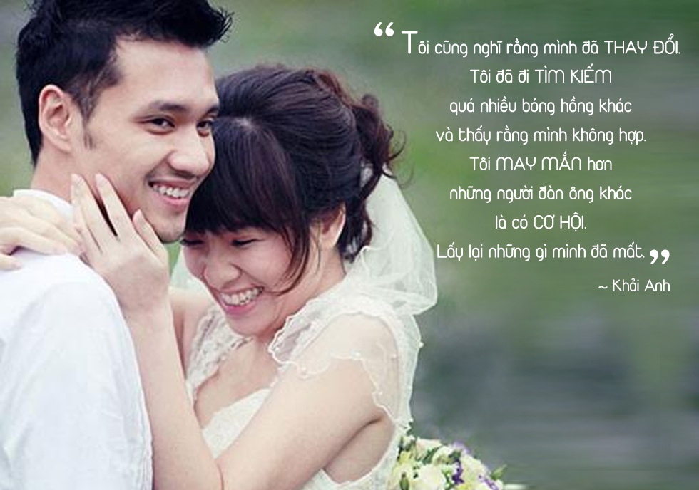 | Cuộc tình của đạo diễn Khải Anh và MC Đan Lê từng tiêu tốn không ít giấy mực của giới truyền thông. Chàng là mối tình đầu của nàng nhưng sau đó họ lại rẽ sang những nẻo đường khác nhau. Đan Lê đã trải qua một lần đò trước khi trở về trong vòng tay Khải Anh. Vị đạo diễn này cũng tiết lộ: "Việc giành lại khó khăn hơn nhiều. Tôi phải chứng minh cho cô ấy sự chân thành của tôi". |