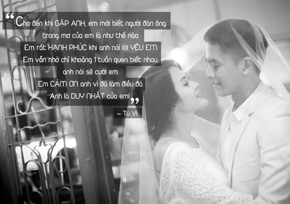 | Trong hôn lễ được tổ chức cuối tuần vừa rồi, Văn Anh và Tú Vi có nhiều chia sẻ khiến khách mời và cả giới truyền thông thích thú, ấn tượng khi trao lời thề nguyền sẽ sống bên nhau suốt đời. Họ quen và yêu nhau khi cùng tham gia bộ phim truyền hình Bếp hát. Tuy nhiên, Văn Anh và Tú Vi đã gặp không ít rào cản trong cảm xúc khi tìm hiểu nhau. |