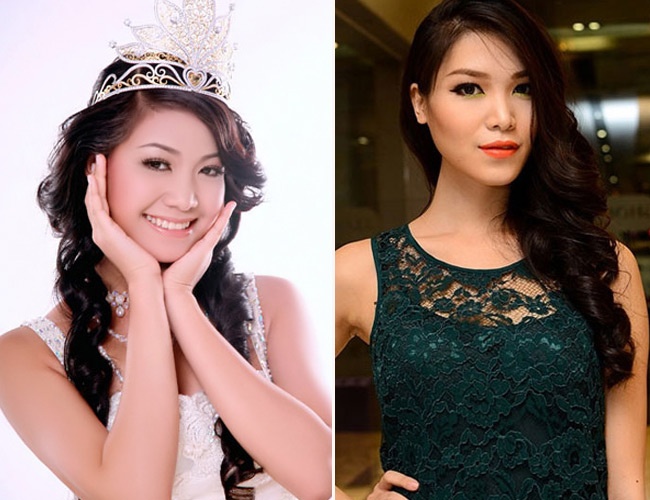 Ngày mới đăng quang, Hoa hậu Thùy Dung có gương mặt bầu bĩnh (trái). Giờ đây, cô sở hữu chiếc cằm nhọn hoắt (phải).