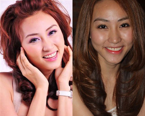 Văn Mai Hương cũng dính nghi án độn cằm. Trước kia, cô có gương mặt bầu bĩnh, còn hiện tại (phải) cằm của cô đã nhọn ra rất nhiều.