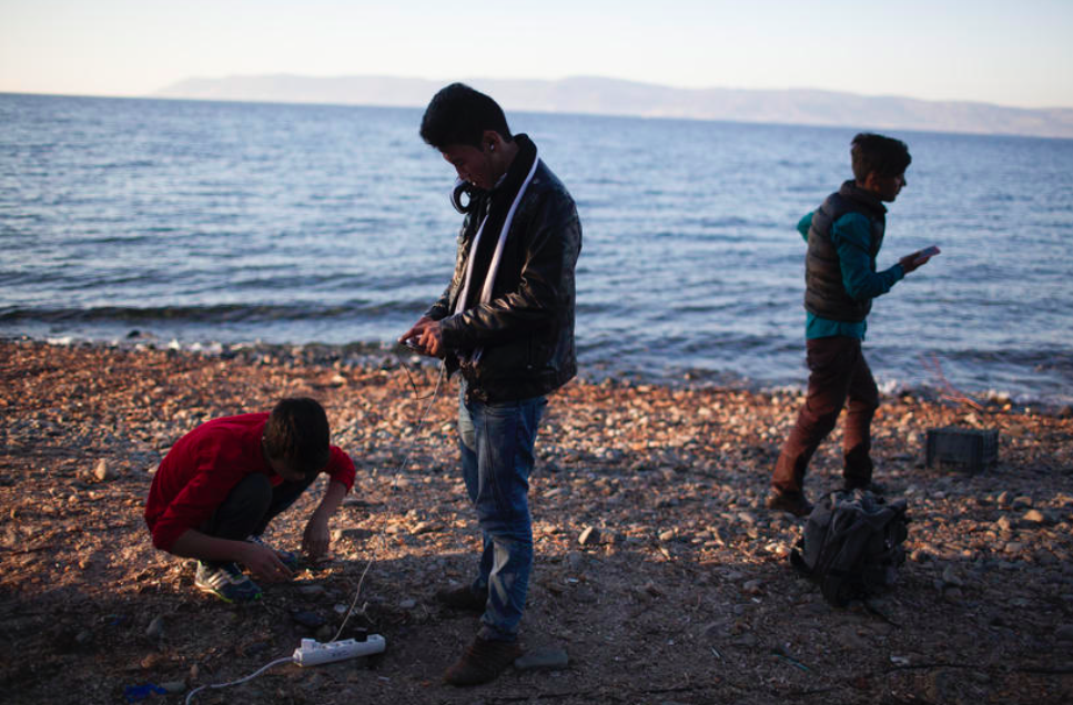 | Người tị nạn sạc điện thoại tại Lesbos. Ảnh: Cnet. |