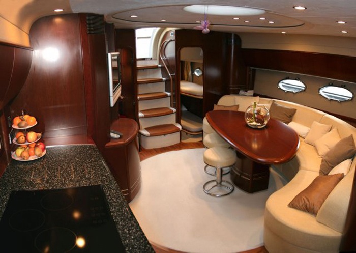 Du thuyền trang bị nhiều tiện nghi gia đình như một căn hộ thu nhỏ, nhà bếp thiết kế với tủ lạnh được gắn âm tường, có cả lò vi sóng, máy pha cà phê… nội thất bên trong bằng gỗ cao cấp. Du thuyền này có chiều dài khiêm tốn, chỉ 12m. Meridian 408 cũng có giá 1 triệu USD.