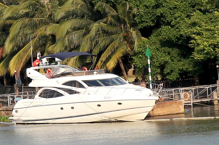Chiếc du thuyền Meridian 408 thuộc sở hữu của Sacombank, đang được neo đậu tại một bến tạm thuộc huyện Nhà Bè.