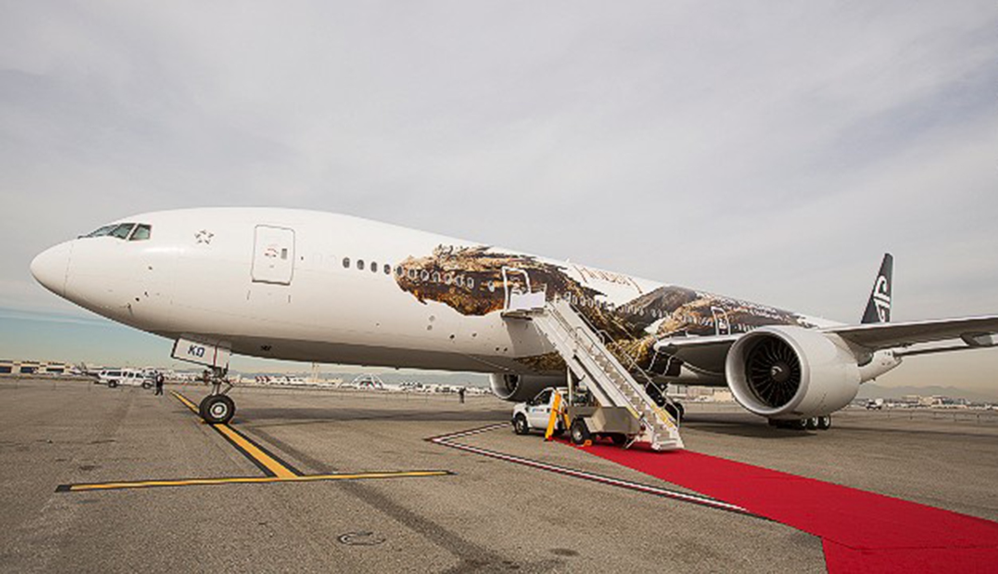 Trong nhiều năm qua, Air New Zealand thú hút được chú ý với hình ảnh liên quan tới các bộ phim nổi tiếng Chúa tể chiếc nhẫn và Hobbit trên thân máy bay. Air New Zealand cho trang trí hình ảnh liên quan tới các bộ phim trên thân máy bay nhân dịp ra mắt mỗi phim. Trong ảnh là máy bay được trang trí với hình ảnh trong phim Smaug. |