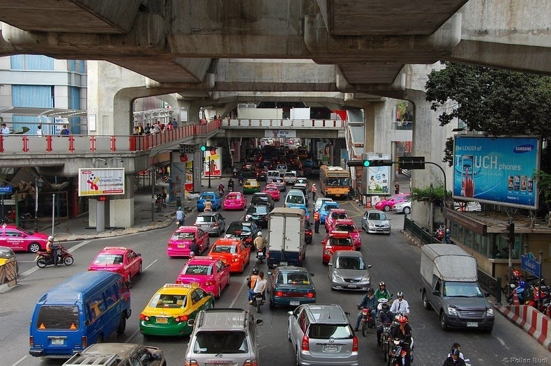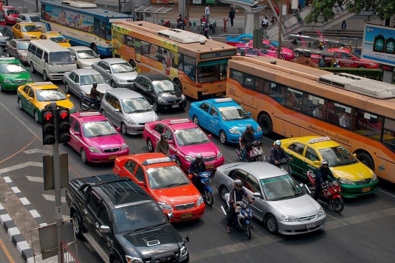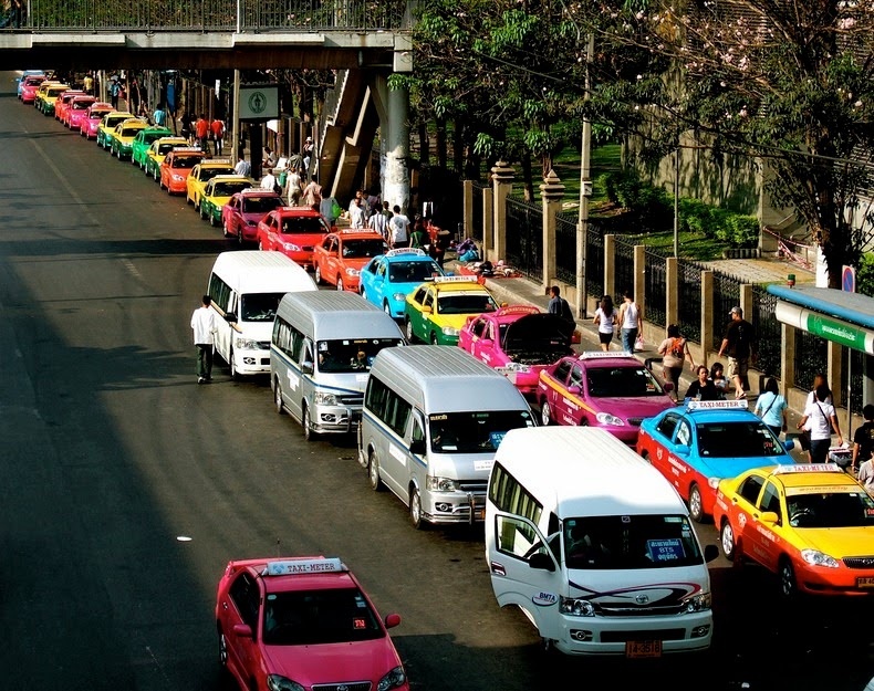 | Ở Bangkok có xe taxi chỉ mang một màu duy nhất như hồng, cam, tím, xanh mạ, vàng, cũng có những chiếc taxi lại kết hợp cả hai màu với nhau. Trong khi màu xe taxi ở những quốc gia khác không có gì đặc biệt, thì xe taxi ở Bangkok được mã hóa bằng màu. |