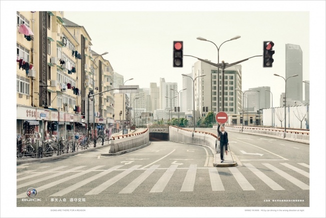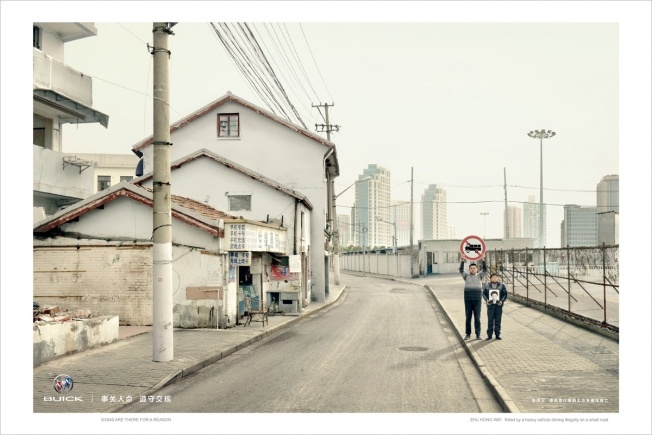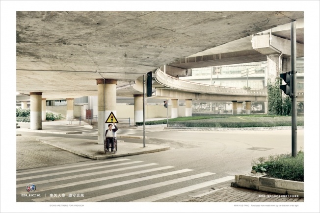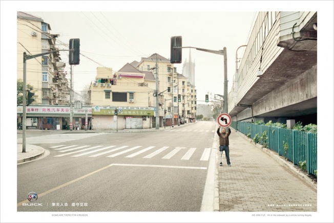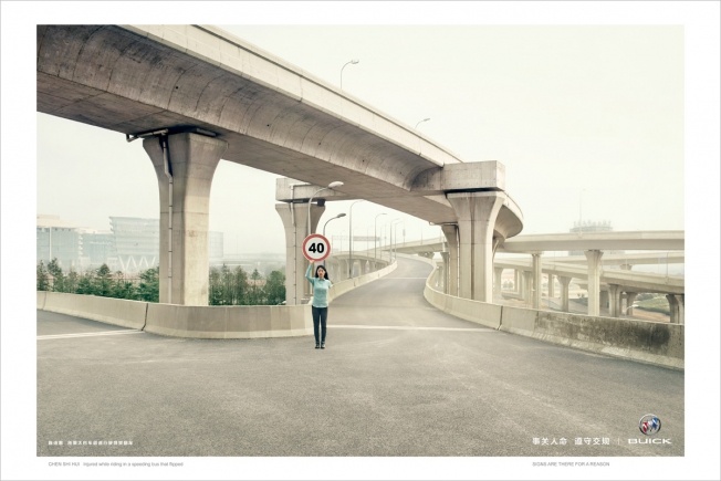 | Với hình ảnh những người từng là nạn nhân của tai nạn giao thông cầm tấm biển hiệu và đứng giữa đường để truyền tải thông điệp lái xe an toàn, quảng cáo của Shanghai General Motors để lại những ấn tượng hết sức mạnh mẽ cho người xem. Trên hình là cô gái bị cụt tay với biển hạn chế tốc độ. |