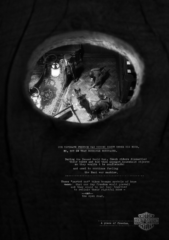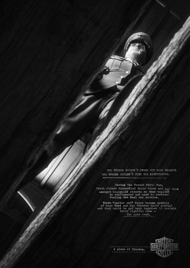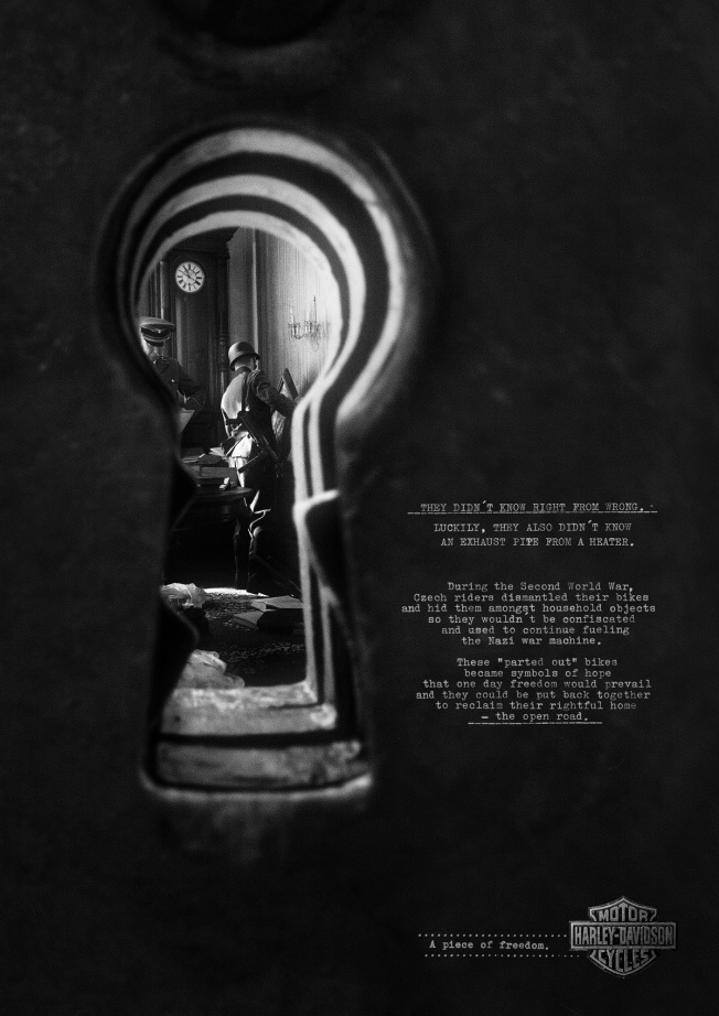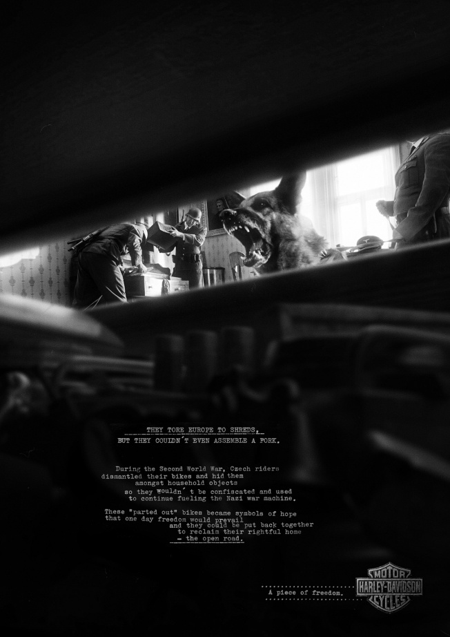 | Harley - Davidson khéo léo lồng ghép bối cảnh lịch sử hồi Thế chiến II vào trong quảng cáo của mình. Khi ấy, người dân Czech phải giấu đi những chiếc xe máy của họ khỏi bọn phát xít và luôn mơ về một ngày nào đó được tự do rong ruổi trên các cung đường. |