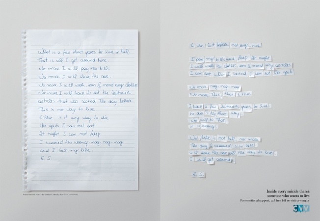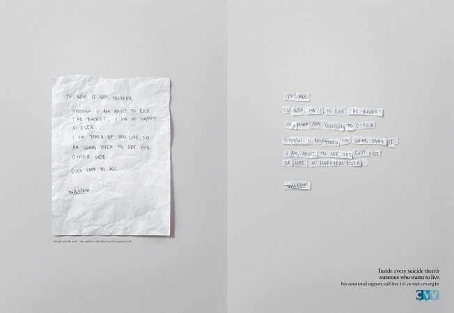 Những bức thư tuyệt mệnh được trình bày lại thể hiện ham muốn được sống của những người đang có ý định tự tử. Đây là chiến dịch của đường dây nóng hỗ trợ những người đang gặp vấn đề trầm trọng về cảm xúc ở Brazil.