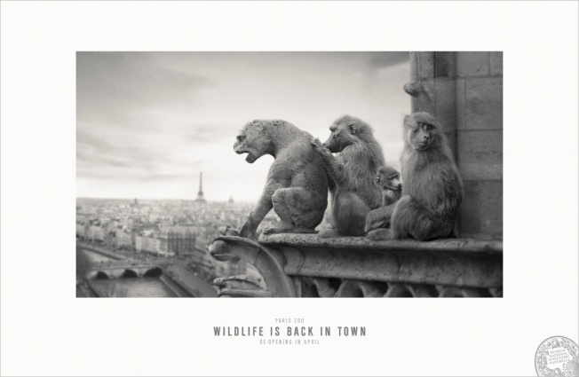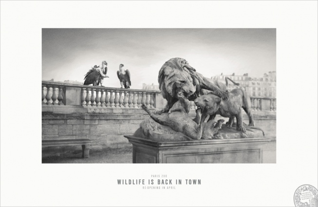 | Quảng cáo của một vườn thú ở Paris, với thông điệp rằng họ đang mang thiên nhiên hoang dã trở lại với người dân sống ở kinh đô ánh sáng. |