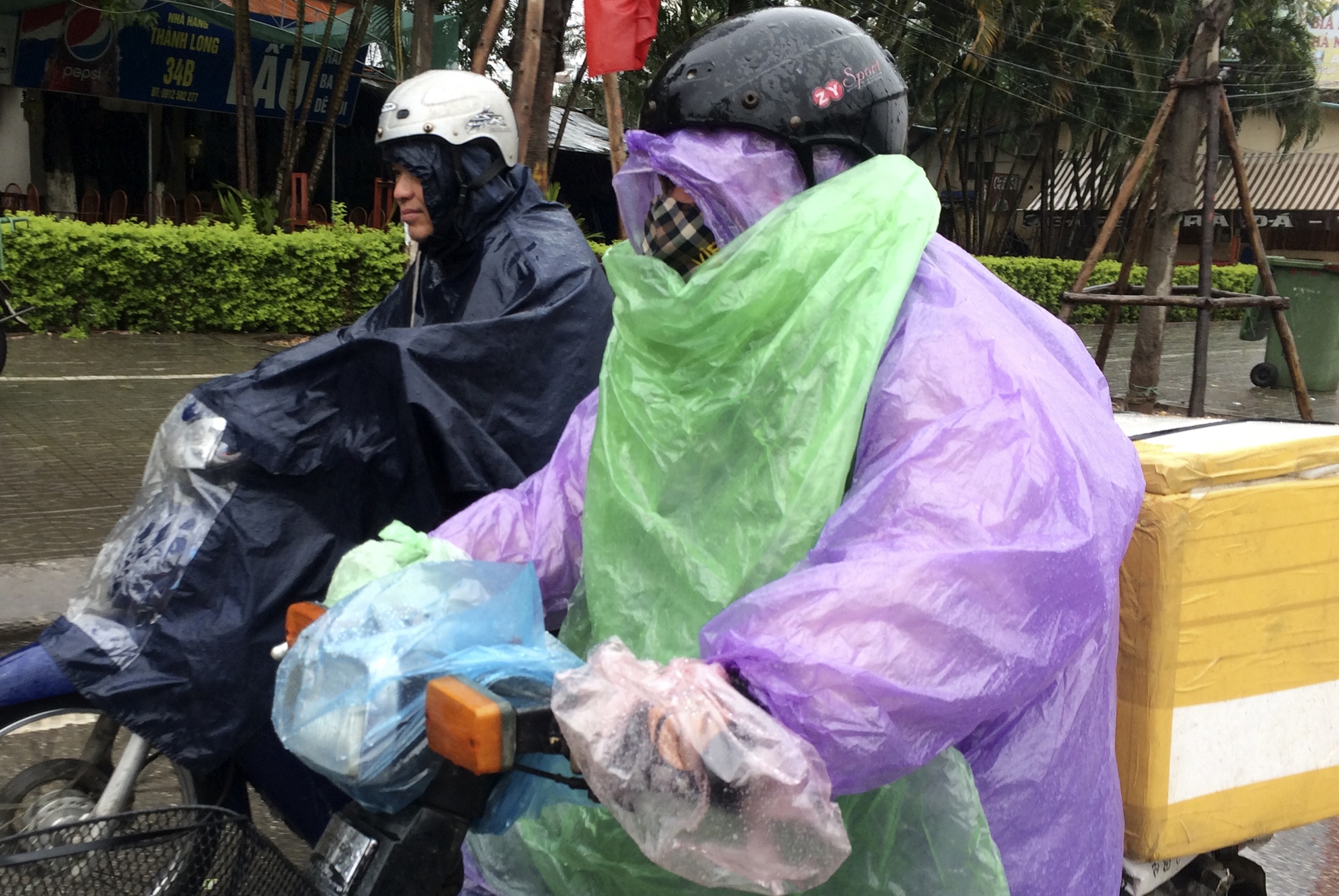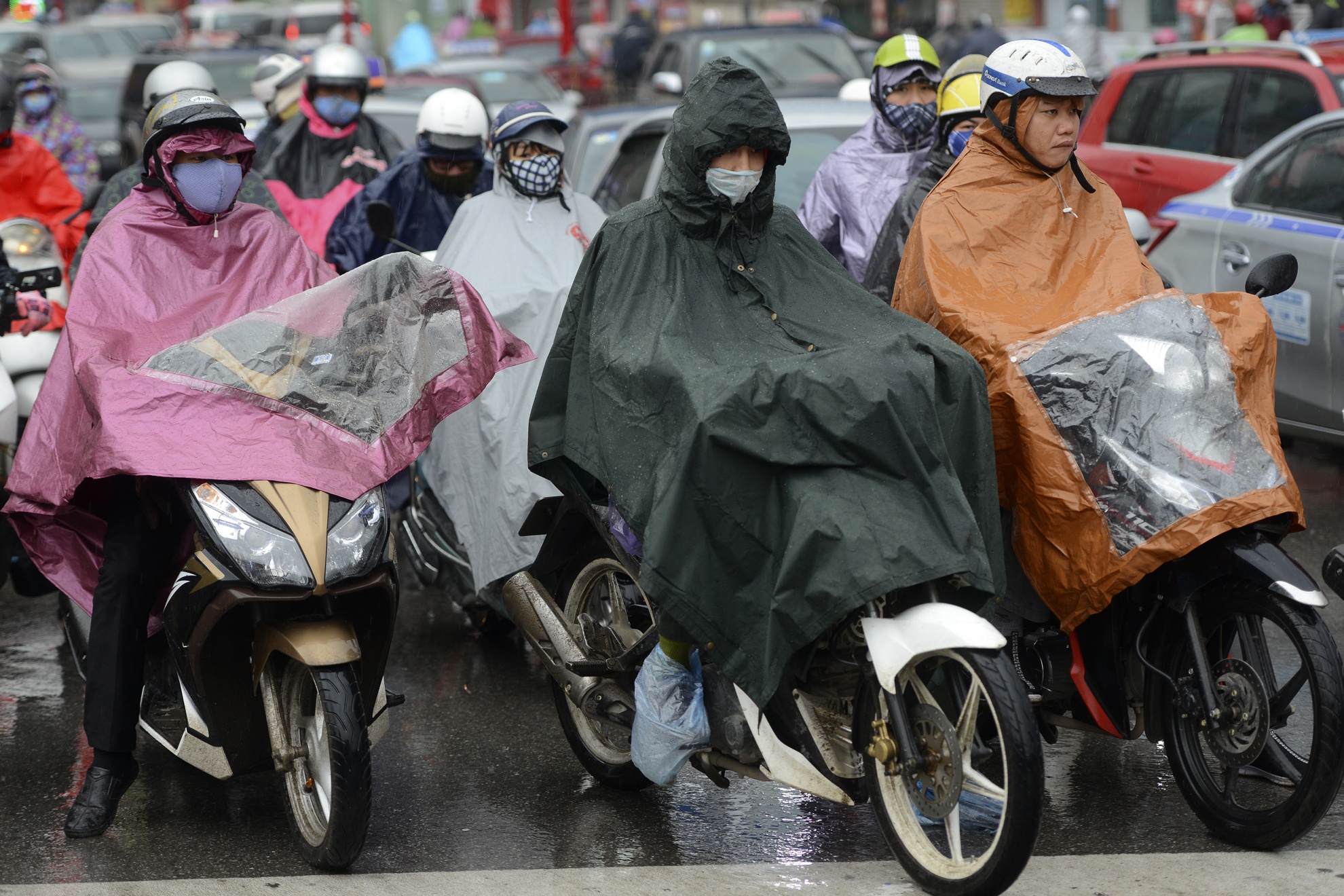 | Một phụ nữ chạy xe máy trên đường Nguyễn Chí Thanh phủ kín người và xe bằng áo mưa và nilon phủ tay, ngực và cả đầu xe để tránh mưa ướt, gió buốt. |