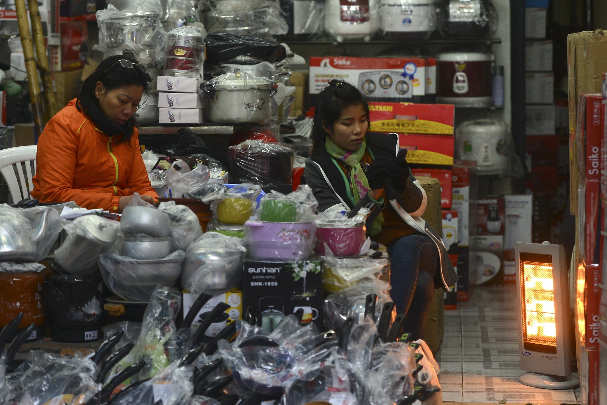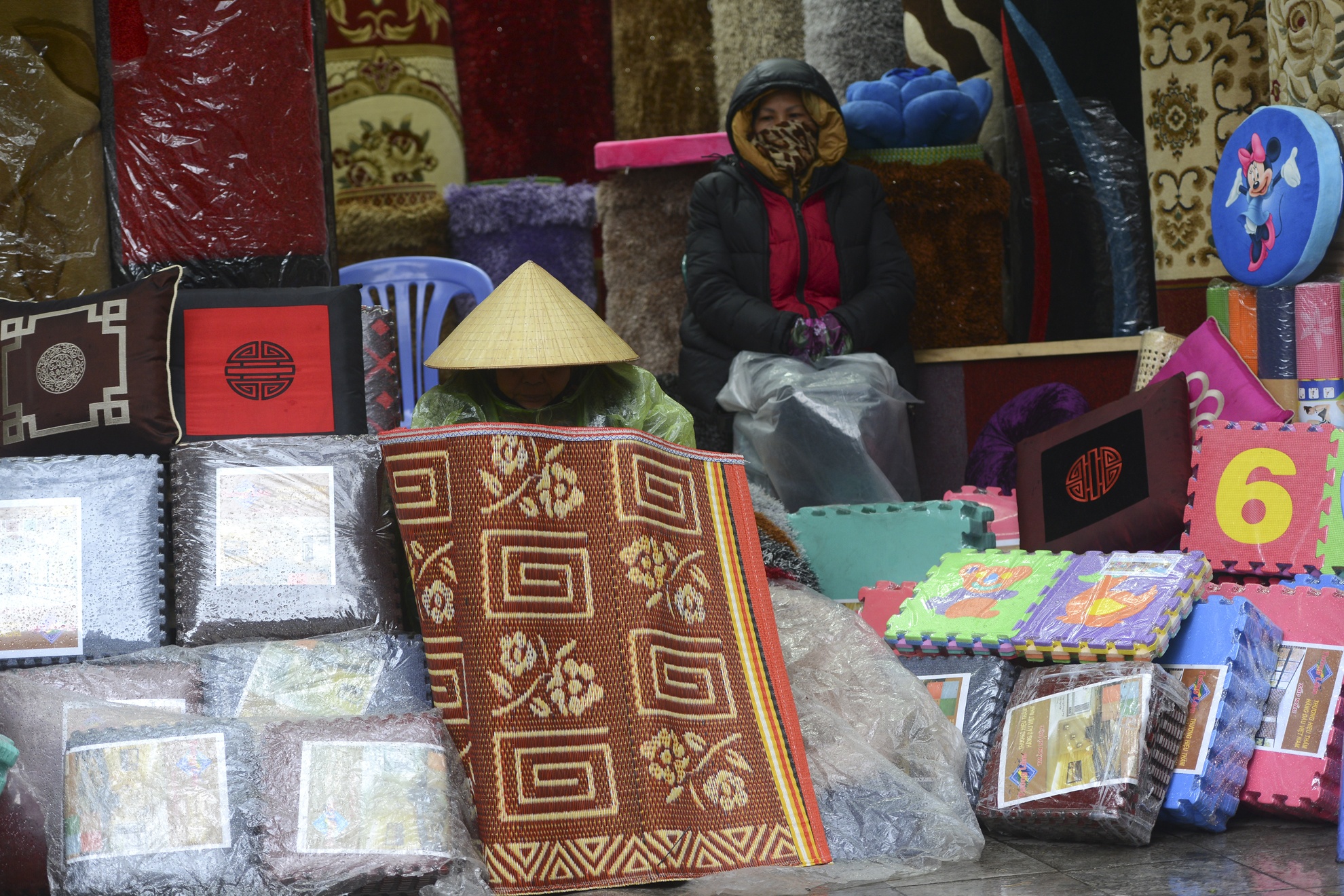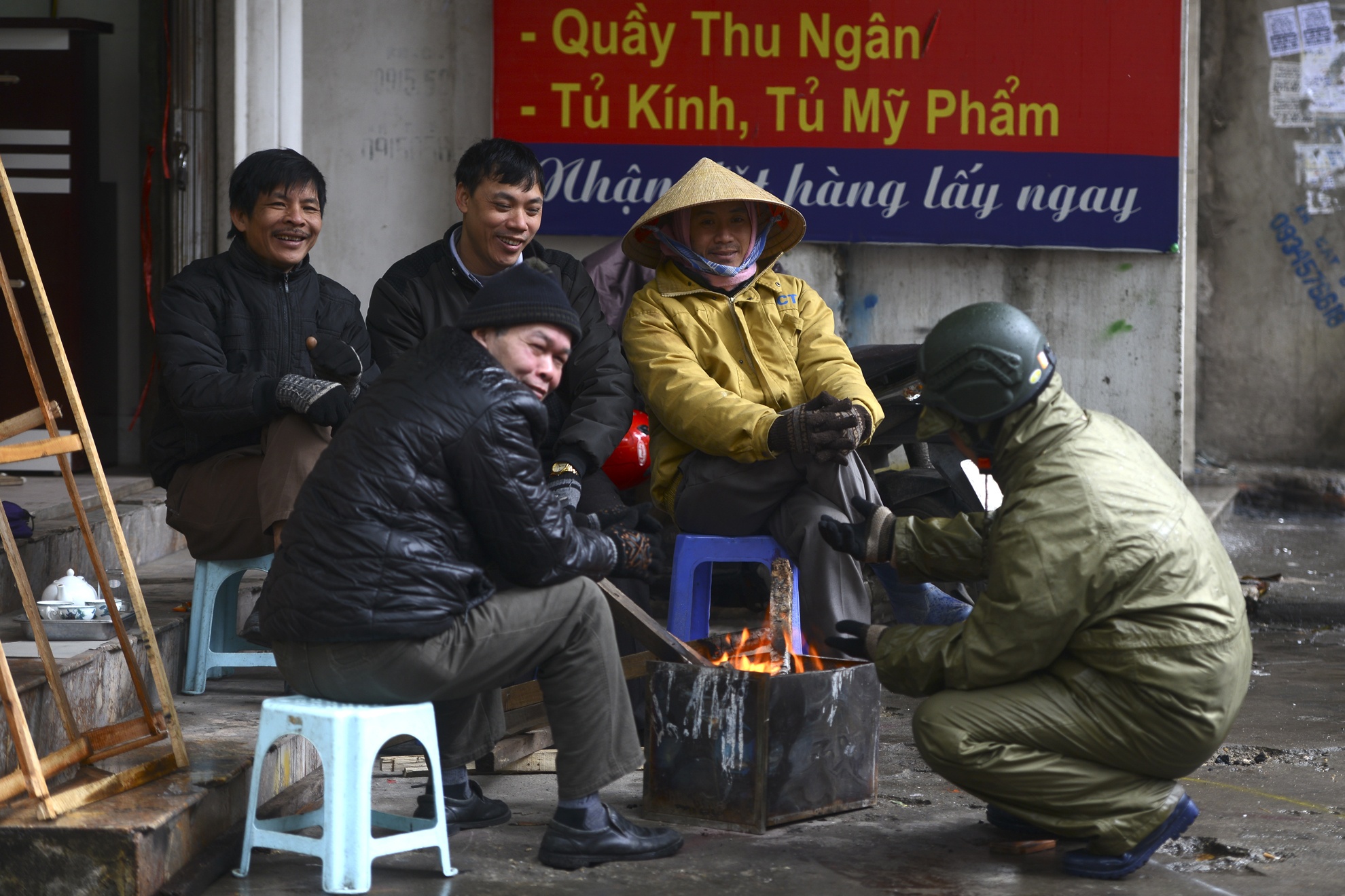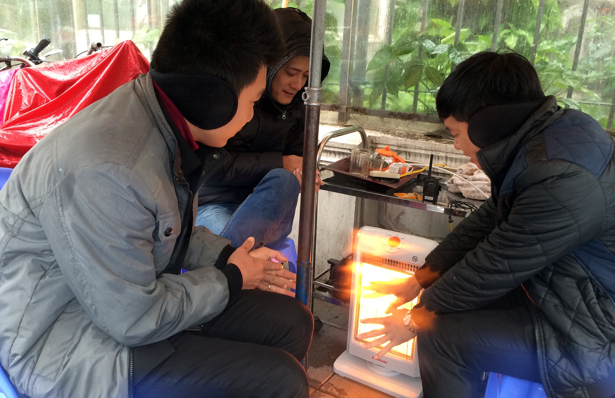 Ngồi trong văn phòng làm việc vẫn phải quấn chăn, vỉa hè xuất hiện máy sưởi điện, bếp củi, người bán hàng quấn nilon, dùng chiếu che chắn... là những chiêu đối phó với giá rét.