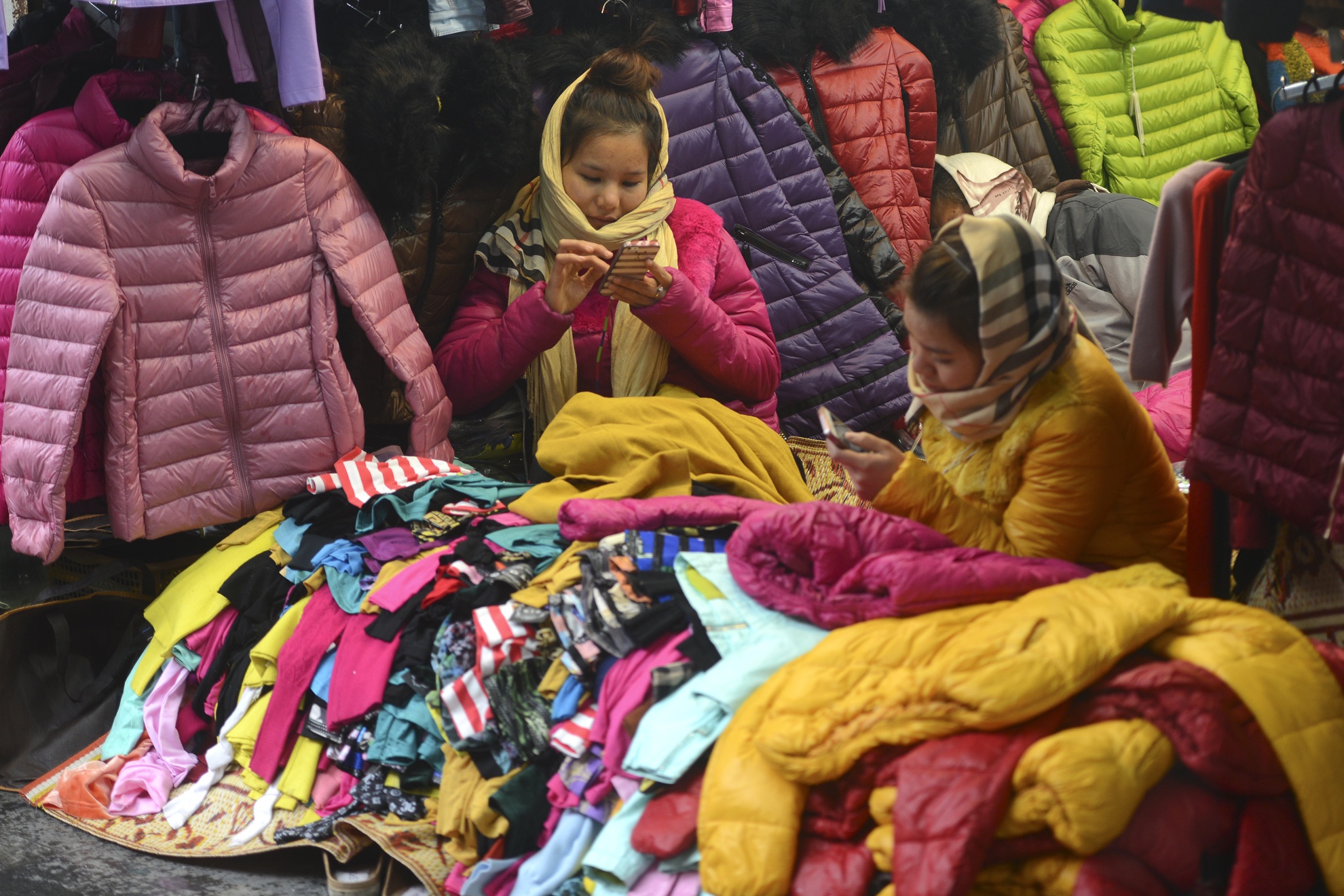 | Nhân viên bán hàng khăn áo kín mít, phủ thêm đống hàng lên người để ủ ấm