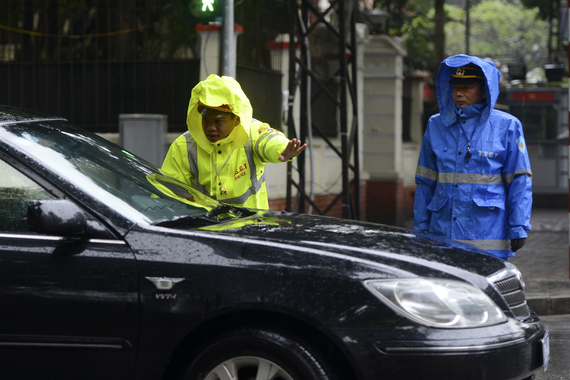| Lực lượng CSGT, TTGT, dân phòng... được trang bị đầy đủ mũ áo sử dụng trong mưa bão làm nhiệm vụ điều tiết giao thông từ sớm trên phố Chu Văn An. |