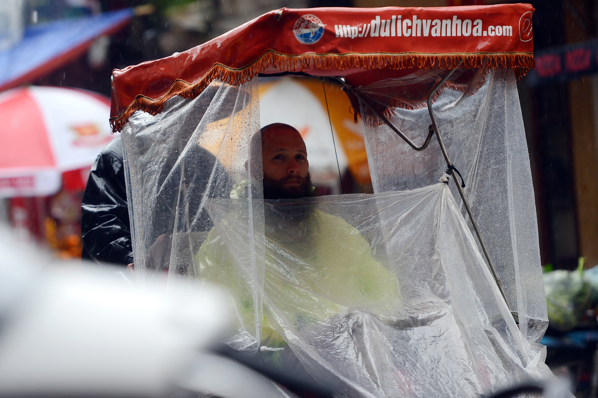 | Người đạp xích lô dùng nilon phủ kín xe chở khách nước ngoài tham quan phố phường Hà Nội. |