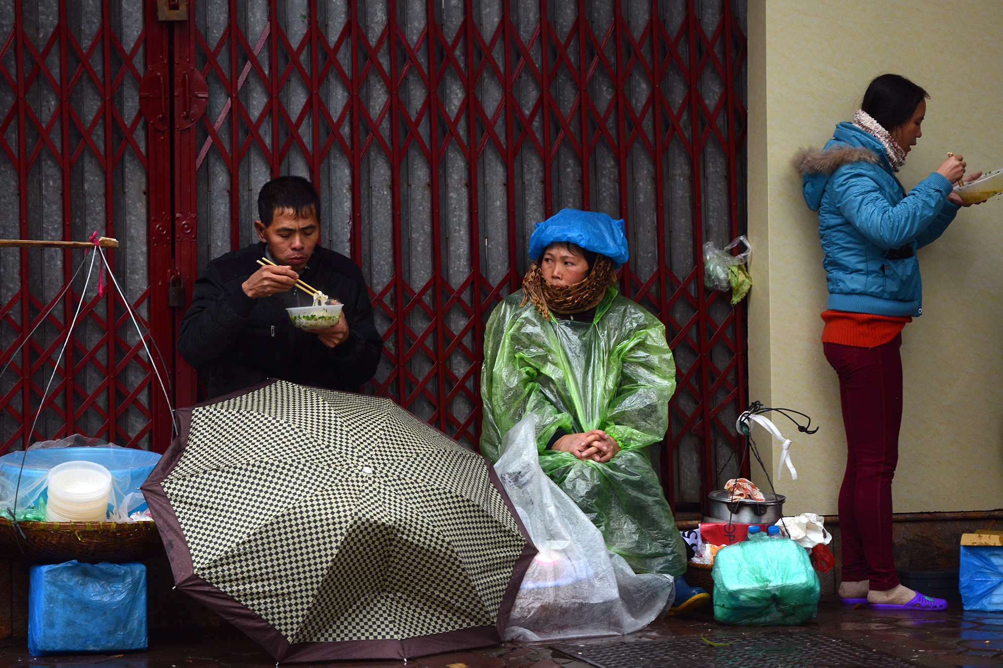 | Những khách hàng ăn vội bát phở ở quán bên đường, lấy năng lượng giữ ấm cơ thể. |