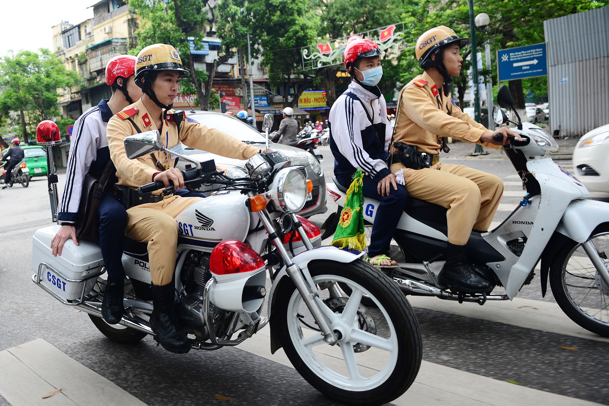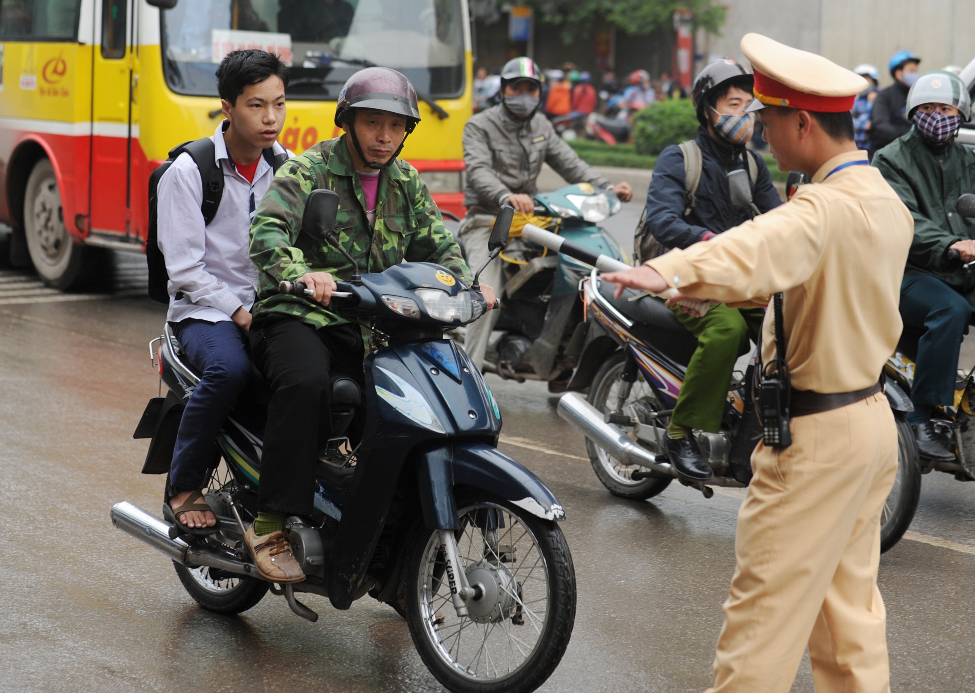 Các trường hợp ngồi sau xe máy không đội mũ cũng bị cảnh sát dừng xe. Ảnh: Hoàng Anh.