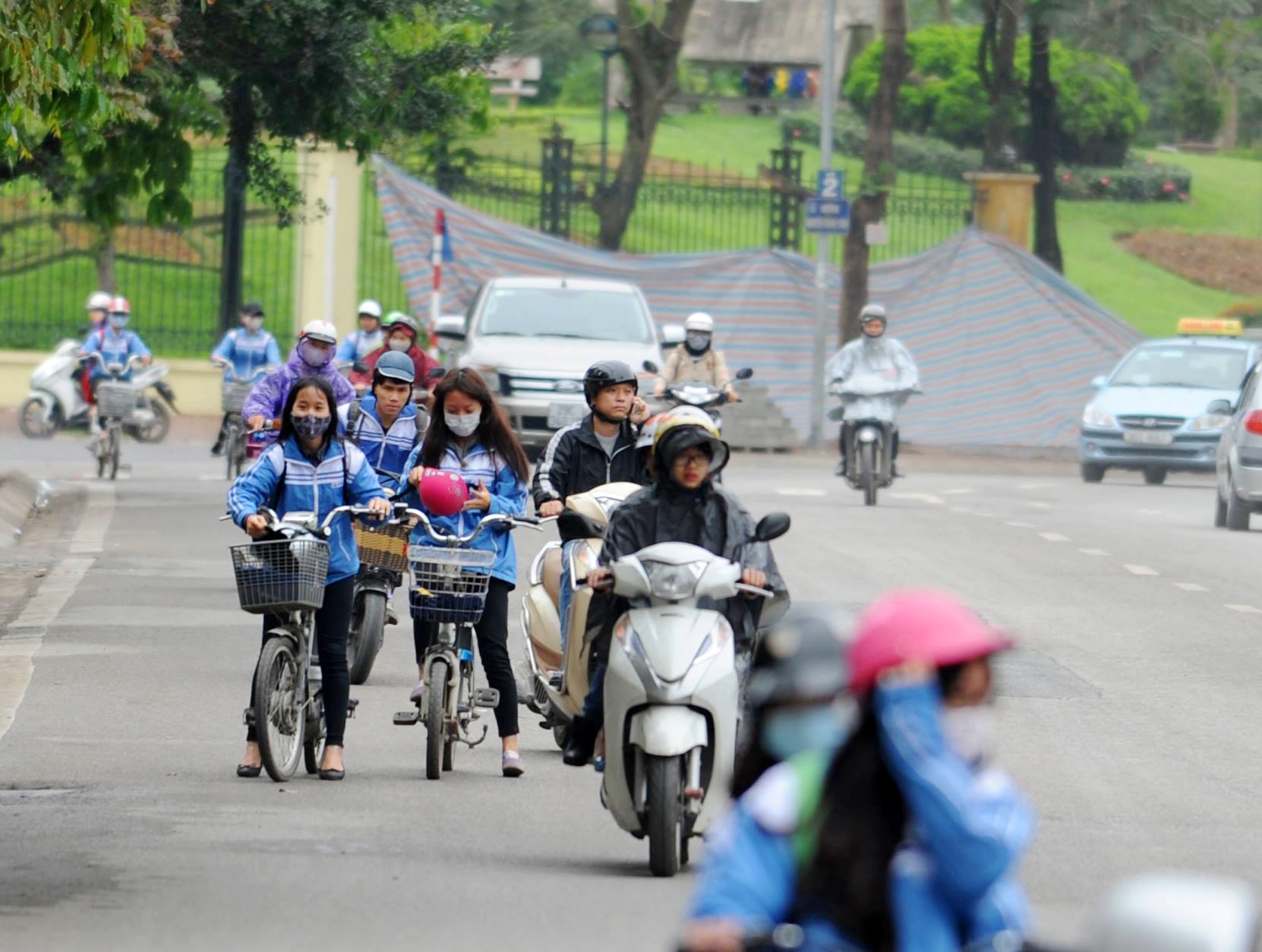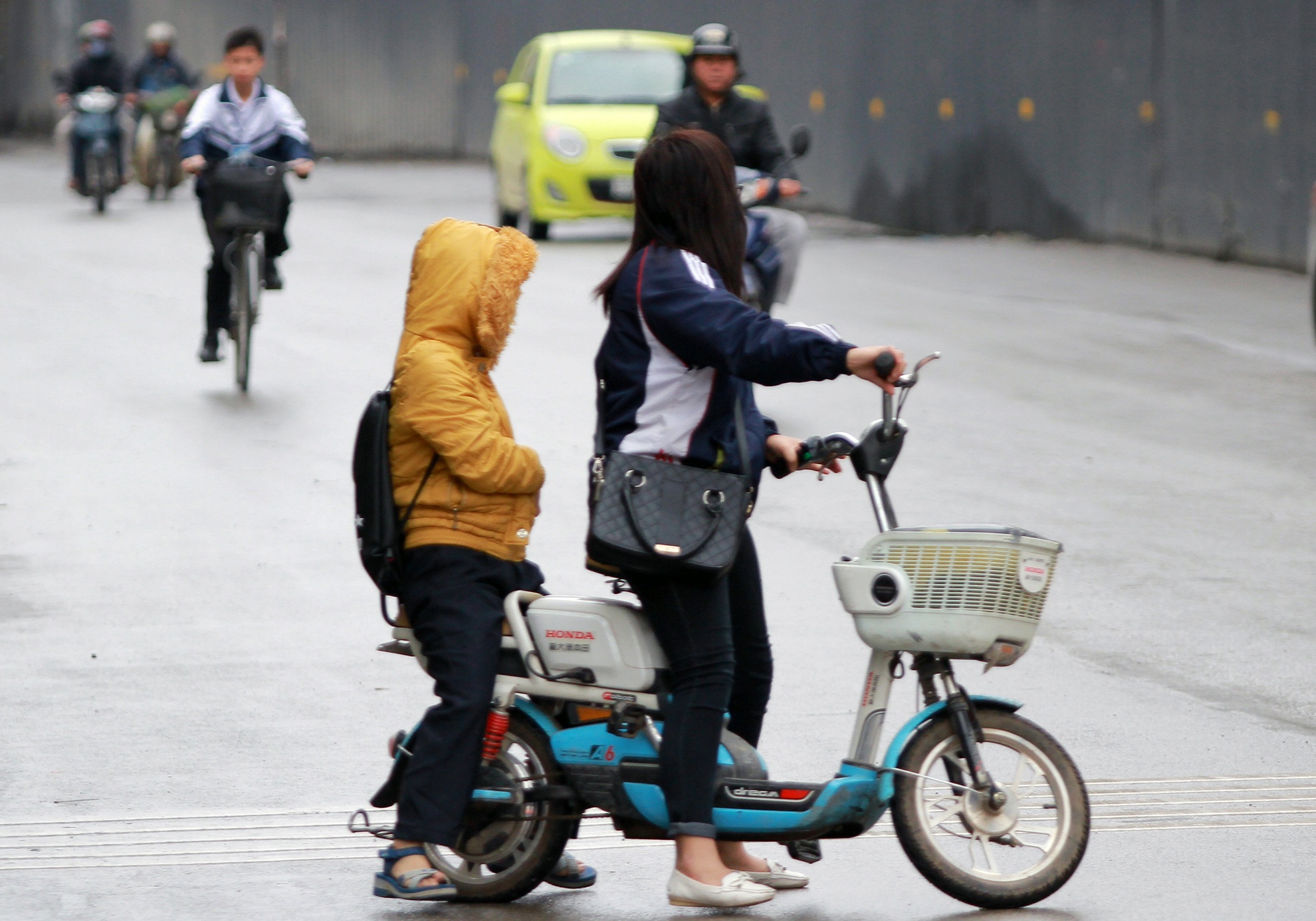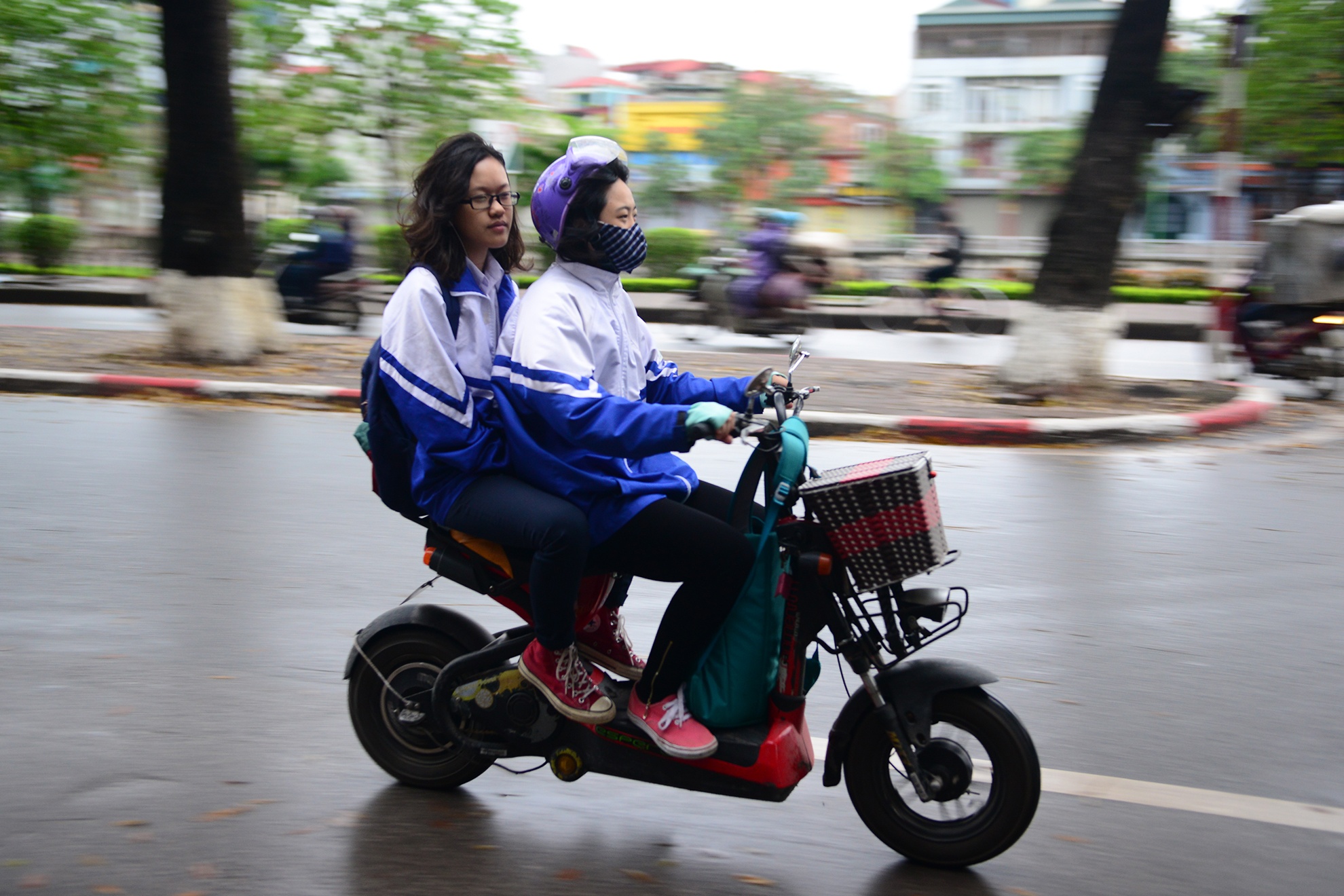 Trên các trục đường có nhiều trường học như Lý Thường Kiệt, Trần Hưng Đạo, Hai Bà Trưng, Hàng Bài, Hoàng Hoa Thám, Láng, Quang Trung (quận Hà Đông)... nhiều học sinh vô tư đầu trần trên xe đạp điện. Ảnh: Hoàng Anh.