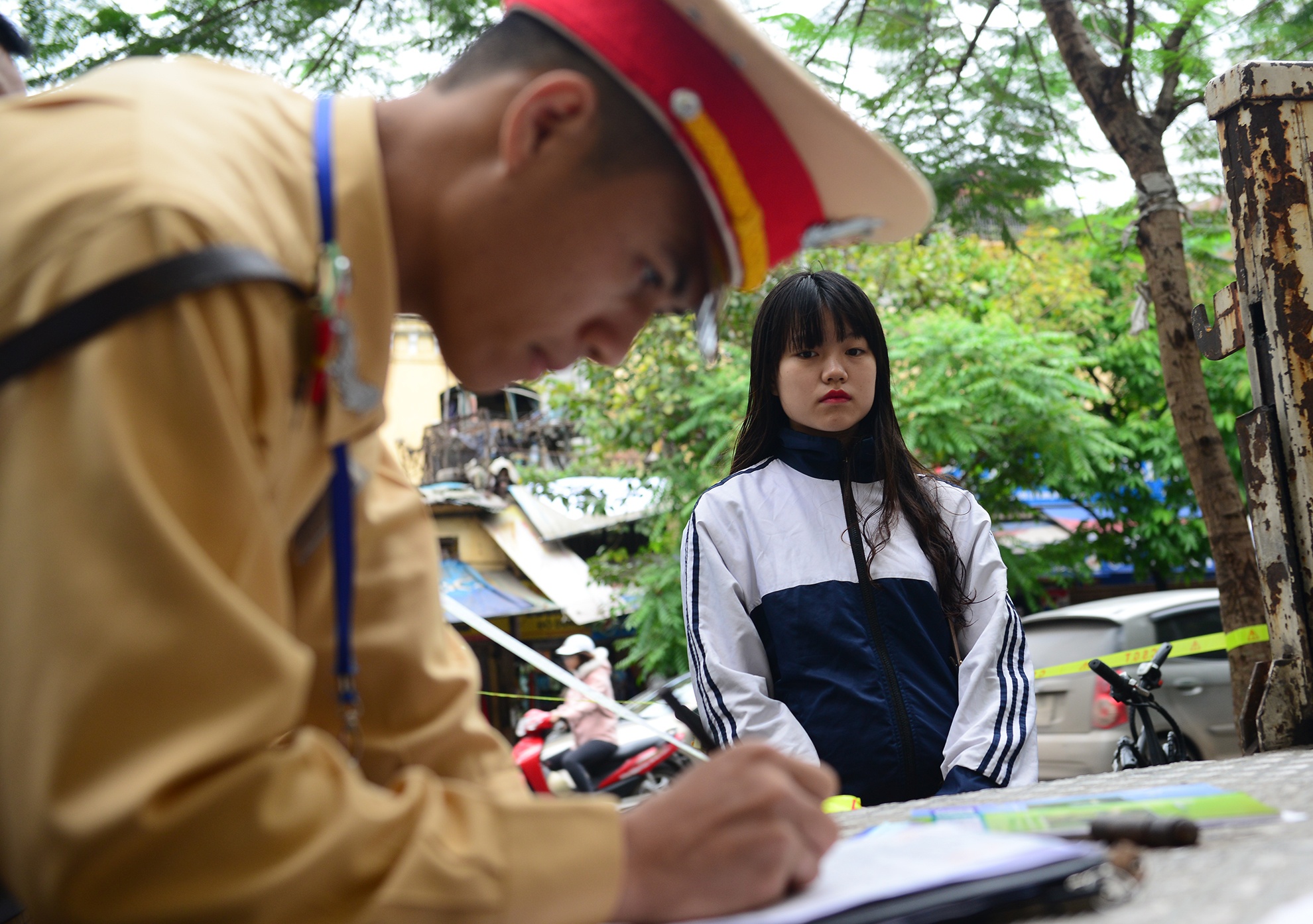 Nữ sinh Nguyễn Hương Anh (lớp 12D4, trường THPT Việt Đức) bị cảnh sát dừng xe ngay sát cổng trường. Hương Anh cho biết, em đội mũ từ nhà nhưng khi tới ngã tư Quang Trung – Lý Thường Kiệt dừng đèn đỏ, còn cách trường chỉ vài chục mét nên đã tháo mũ ra. Ảnh: Anh Tuấn.