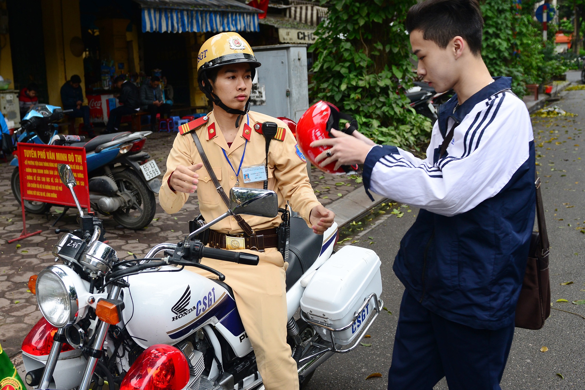 Đánh lái né chốt, xuống xe đi bộ hay vội vàng đội mũ trước khi vào tầm quan sát của cảnh sát là những chiêu mà học sinh Hà Nội ứng phó với việc phạt lỗi không đội mũ bảo hiểm.