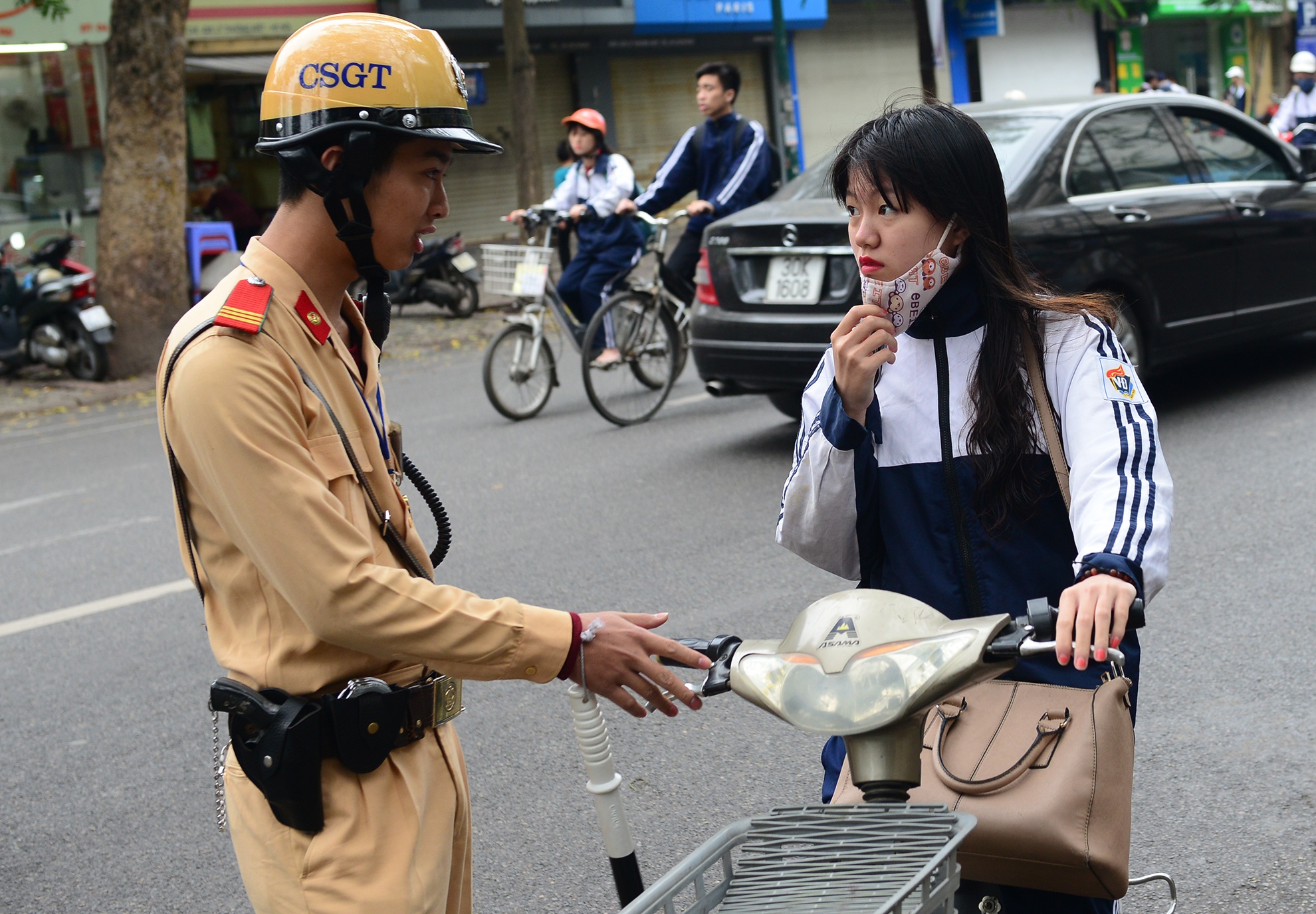 Tại chốt Lê Trọng Tấn - Quang Trung (quận Hà Đông), em Nguyễn Thị Thu Hằng, học sinh trường THPT Trần Hưng Đạo để mũ bảo hiểm trong giỏ xe. Khi cảnh sát hỏi tên và nơi học tập, nữ sinh từ chối trả lời. Ảnh: Hoàng Anh.