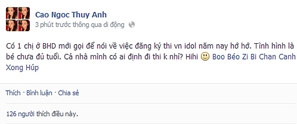 Những chia sẻ cách đây không lâu của Cao Ngọc Thùy Anh trên trang cá nhân được xem là bằng chứng tiếp theo cho thấy chương trình Thần tượng âm nhạc Việt Nam đang thiếu trầm trọng các nhân tố nổi trội. Mặc dù dòng tâm sự ngắn của cô bé từng dự thi The Voice Kids 2013 không thể hiện gì nhiều, song nó cũng chứng minh được ông trùm BHD đang khẩn trương thế nào trong việc tìm kiếm “gà” mới cho mùa giải thứ 5 vừa khởi động.