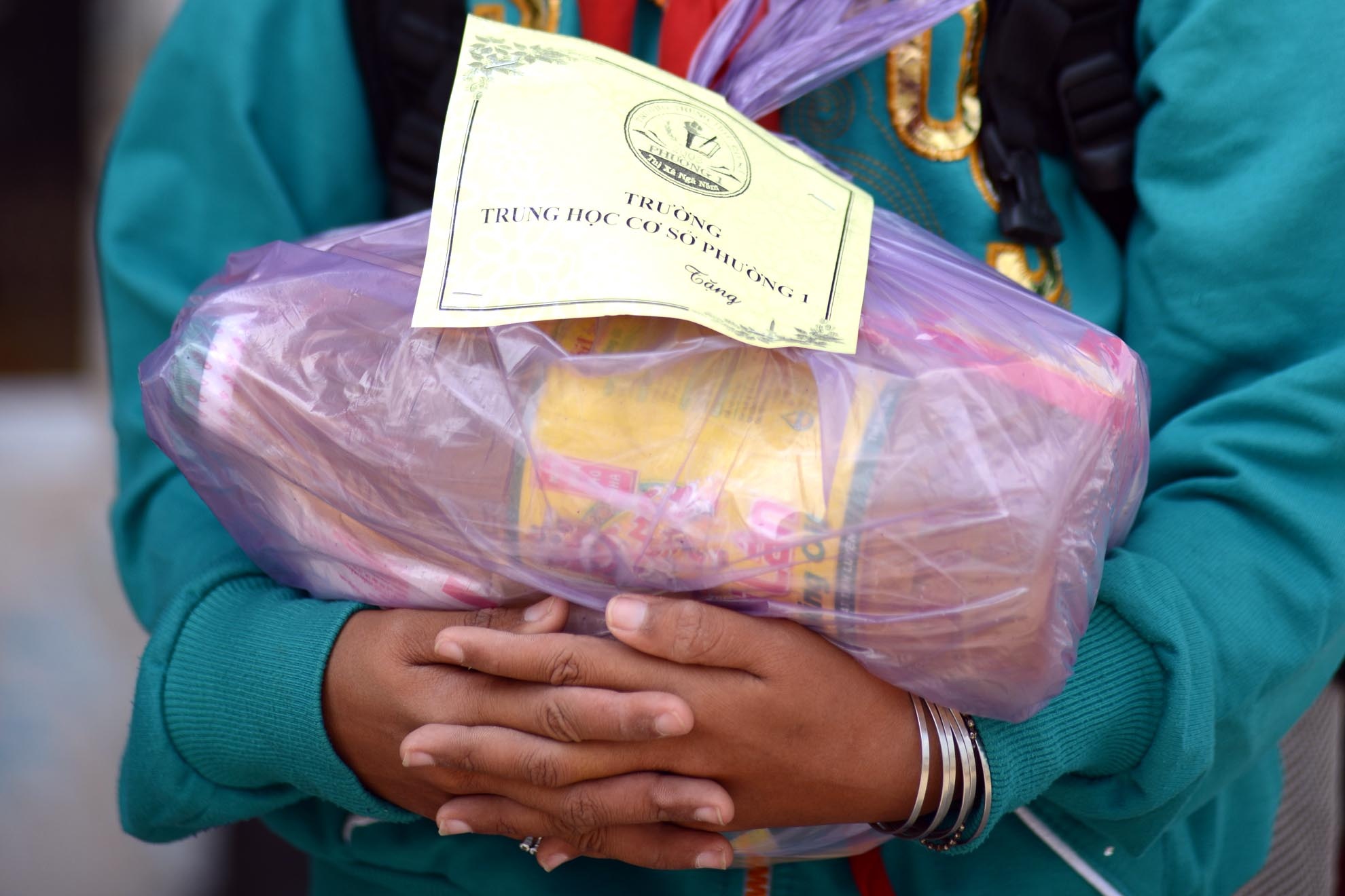 | Cô bé ôm chặt tong lòng phần quà của nhà trường cho học sinh nghèo nhân dịp xuân mới. |