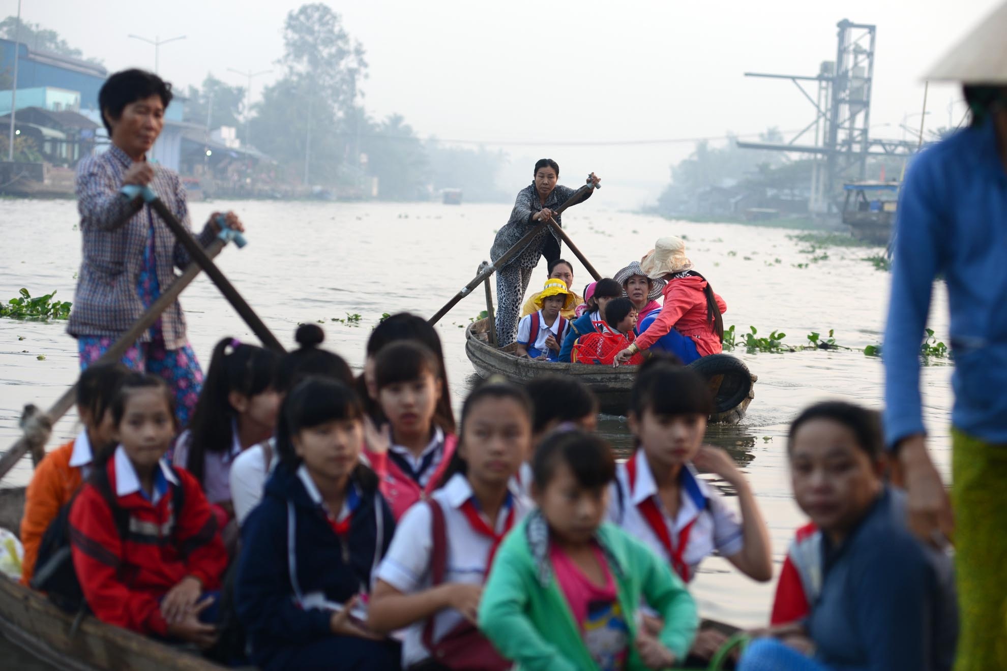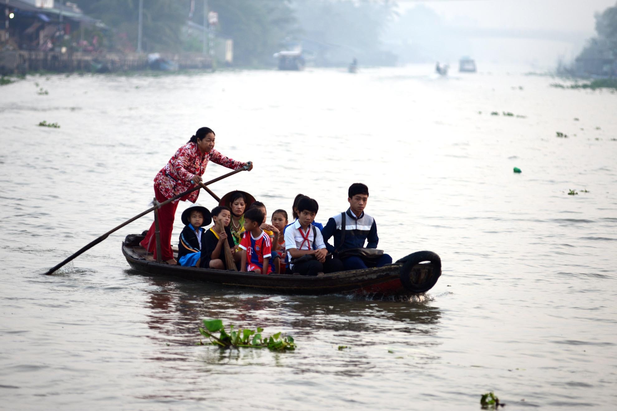 | Nhiều thế hệ học sinh vùng ĐBSCL quen thuộc với con thuyền, mái dầm và những bà, những mẹ chèo đò chở học sinh qua sông. |