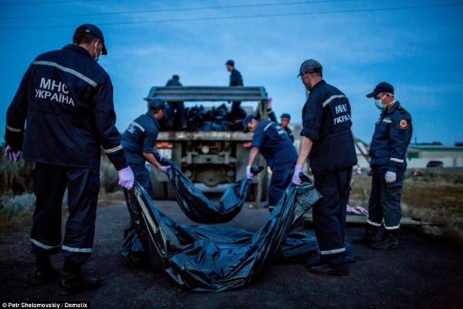 | Việc điều tra, tìm kiếm và xác định danh tính nạn nhân gặp khó khăn bởi MH17 rơi xuống khu vực bất ổn. Sau nhiều ngày đàm phán, phiến quân Ukraine đã đồng ý trao trả thi thể các nạn nhân cũng như hộp đen của máy bay. Ảnh: Daily Mail |
