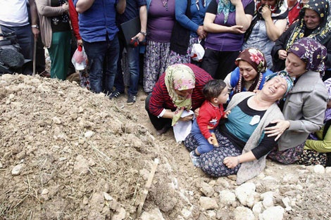 | Những nấm mồ chung của hơn 200 công nhân mỏ nằm san sát. Những người phụ nữ an ủi, động viên lẫn nhau bởi họ cùng chung một nỗi đau và cùng phải gánh chịu sự mất mát. Chồng, cha và con của họ đã trở về và nằm yên dưới những nấm mồ. Ảnh: AP |