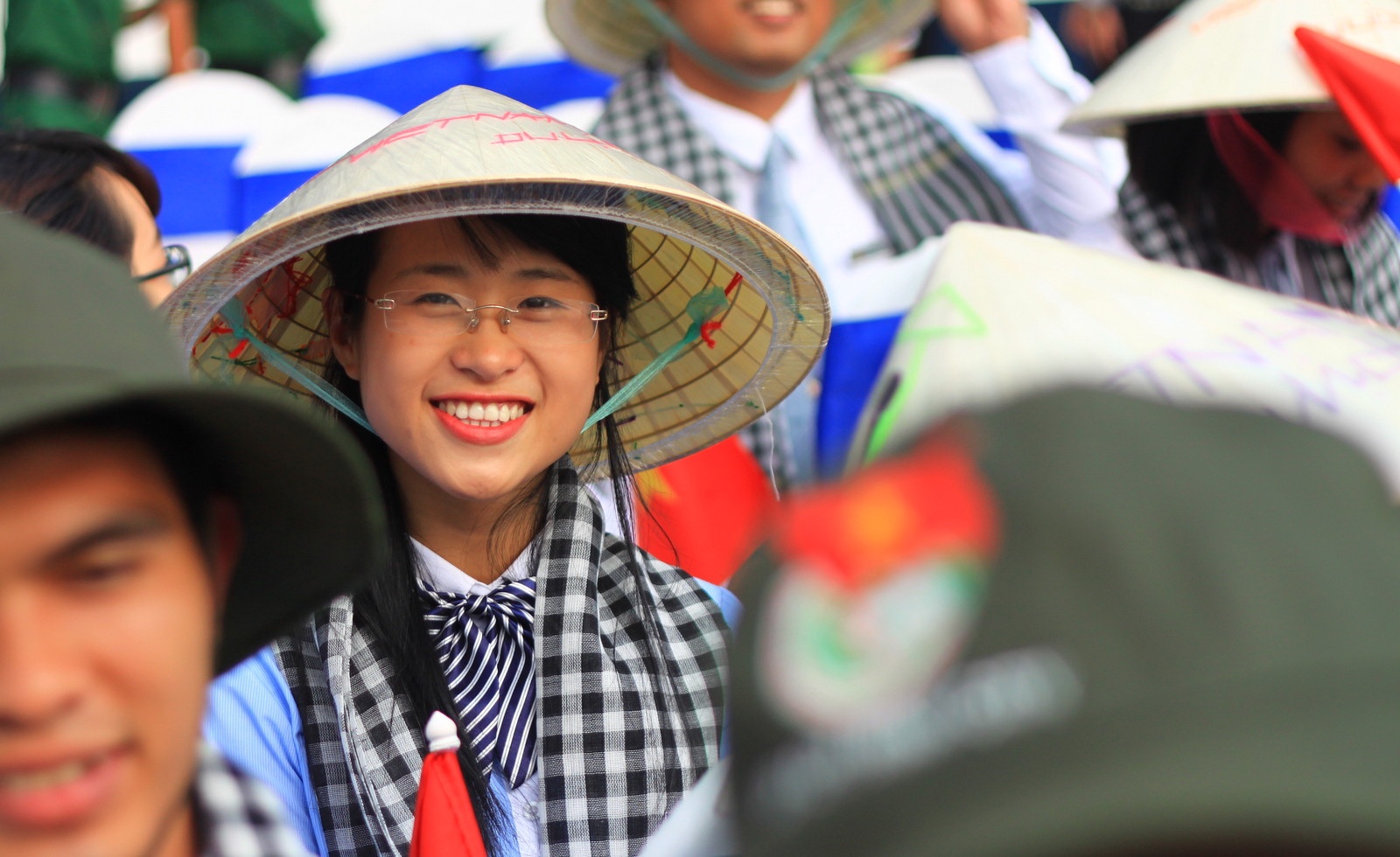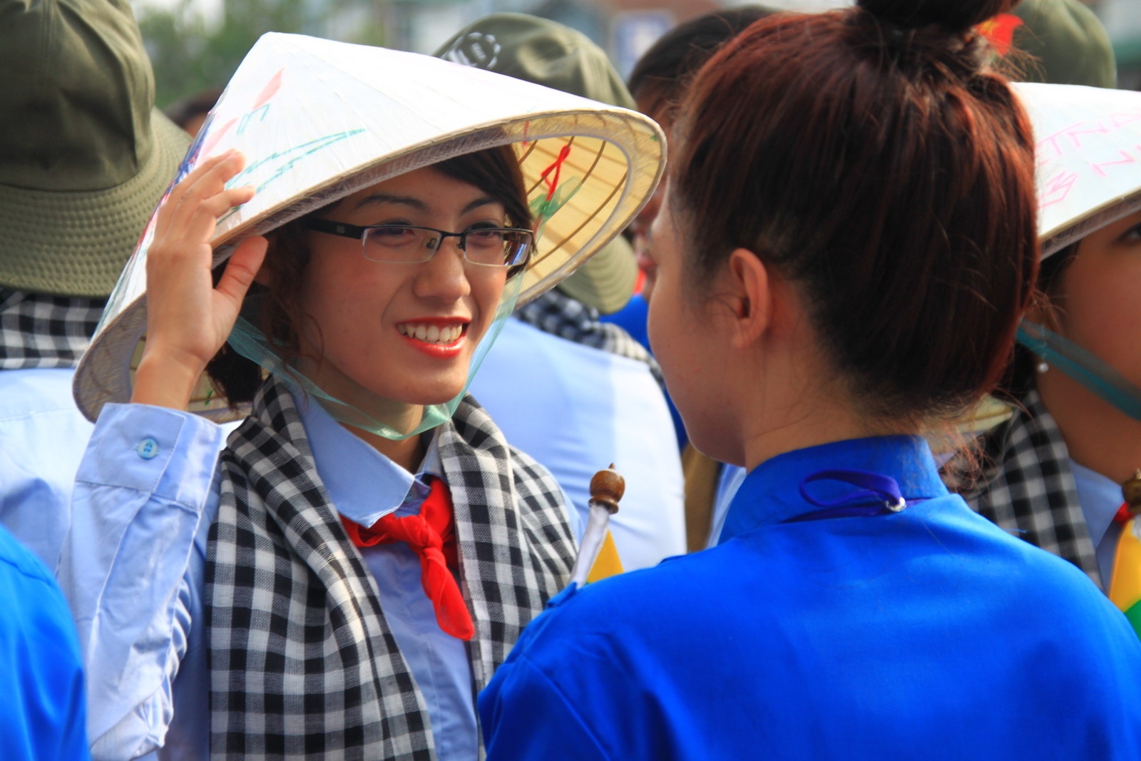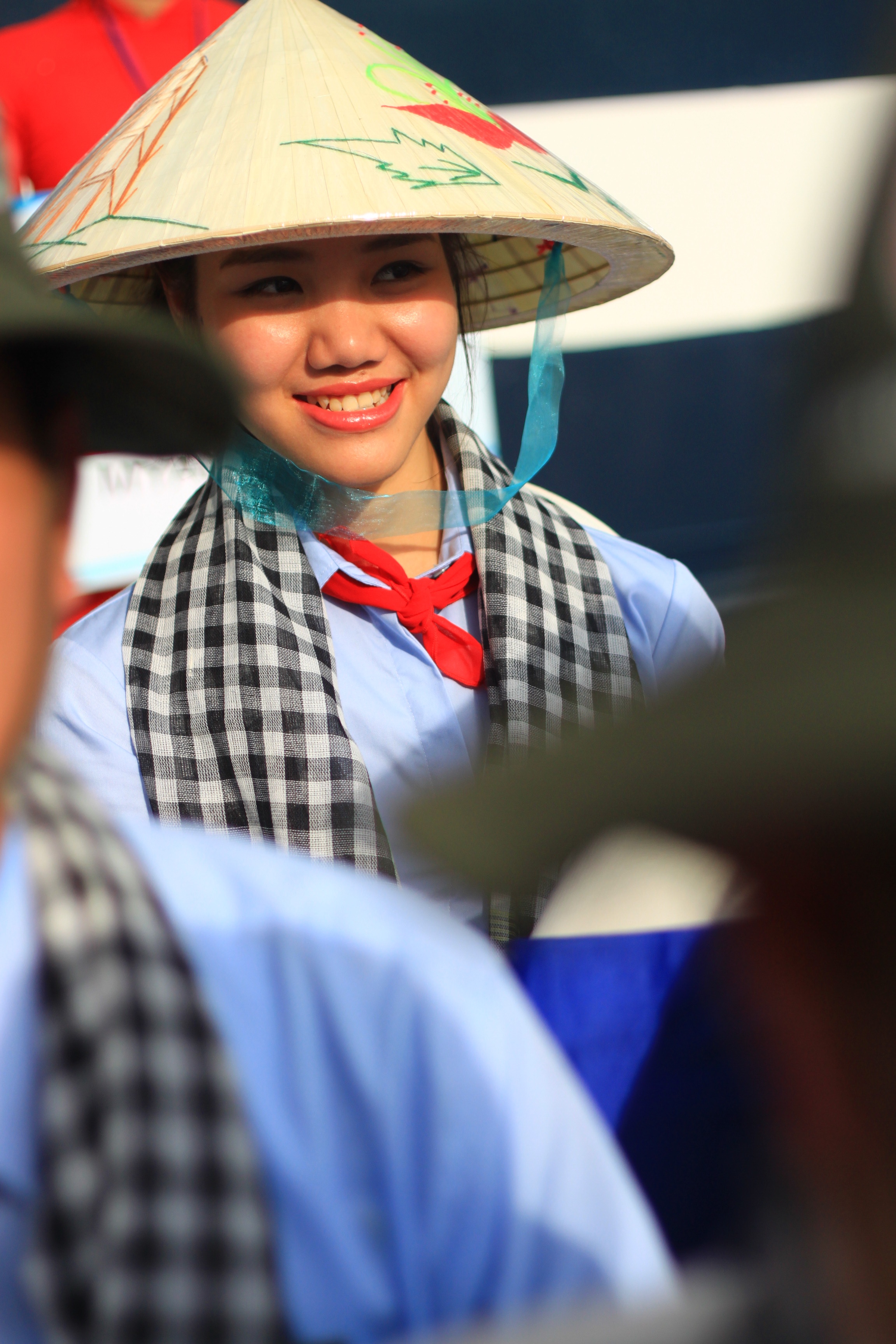 | Những nữ sinh đoàn chủ nhà Việt Nam đã quen thuộc với nón lá, khăn rằn. |