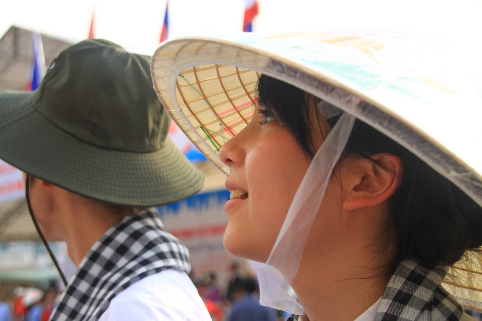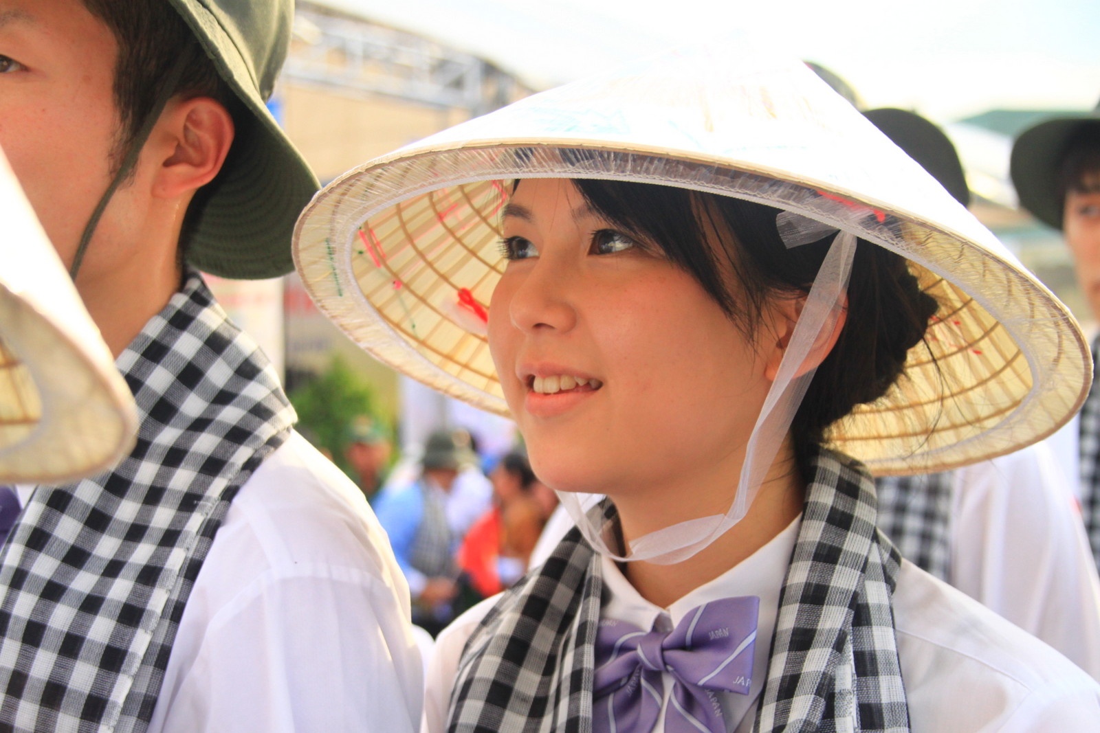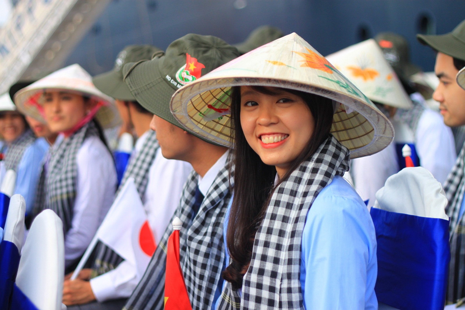 | Chiều 14/11, chiếc tàu Nippon Maru, chở 392 đại biểu trẻ chương trình Tàu thanh niên Đông Nam Á 2013 (SSEAYP) cập bến cảng Sài Gòn. Các bạn được bạn trẻ Việt Nam chào đón thân tình, tặng khăn rằn, nón lá cho nữ sinh các nước. Trong ảnh, một nữ sinh Nhật Bản đội nón lá. |