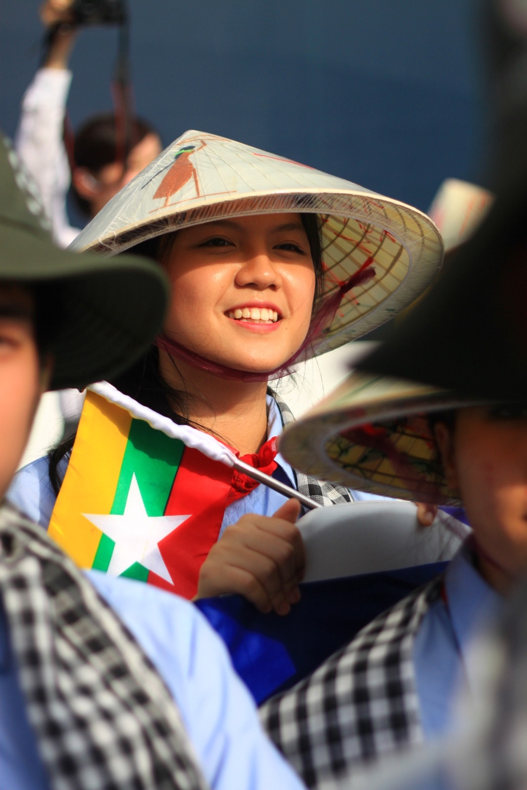 Trong lễ đón tàu Thanh niên Đông Nam Á tới Việt Nam, mỗi nữ sinh của 10 nước Asean và Nhật Bản được tặng nón lá kỷ niệm.