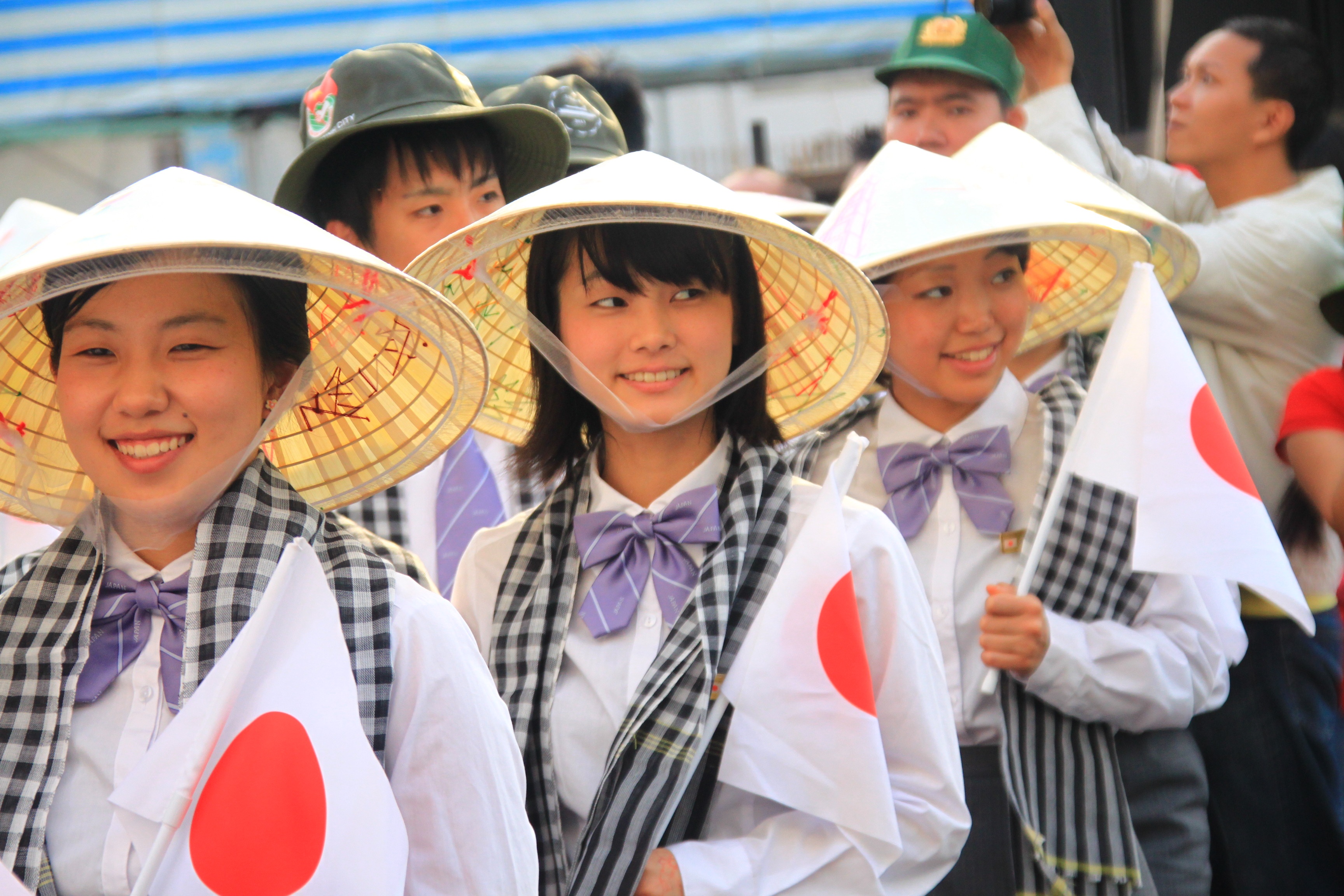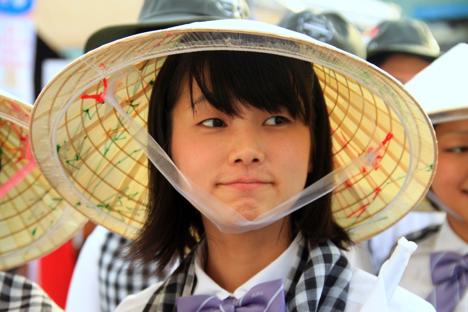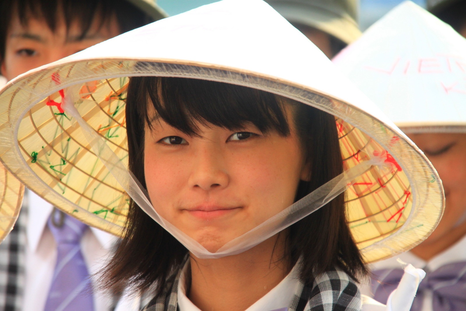 | Hình ành nữ sinh Nhật Bản cười tươi tắn khi đội lên đầu nón lá. |