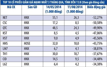 Một số cổ phiếu bị điều chỉnh giảm mạnh trong giai đoạn này là do các doanh nghiệp thực hiện chia thưởng cổ phiếu. Đơn cử như CTCP Bột giặt NET (NET), giá cổ phiếu NET sau điều chỉnh giảm từ 55.100 đồng/CP xuống còn 26.300 đồng/CP, tức giảm hơn 52%. Với nguyên nhân tương tự, cổ phiếu CSC của CTCP Đầu tư và Xây dựng Thành Nam đã giảm hơn 50% trong vòng 3 tháng qua, từ 17.200 đồng/CP xuống 8.500 đồng/CP; cổ phiếu NTP của CTCP Nhựa Thiếu niên Tiền Phong điều chỉnh từ 71.000 đồng/CP xuống 47.000 đồng/CP…