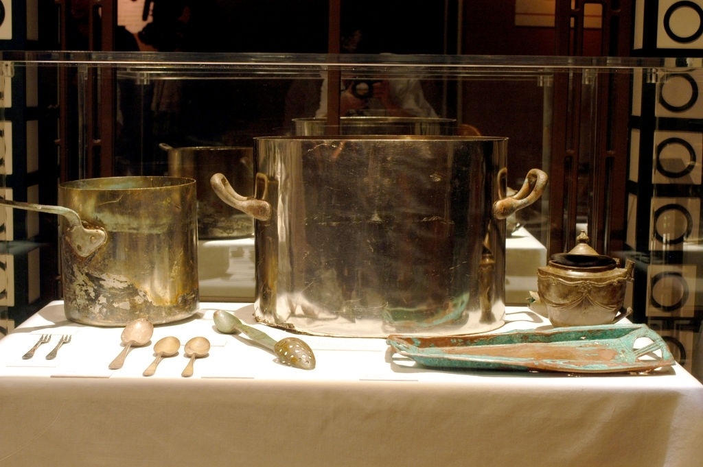 | Những dụng cụ làm bếp được trục vớt từ con tàu xấu số. Đây là một trong số ít các đồ vật tại buổi triển lãm diễn ra ở Los Angeles (Mỹ) vào 9/2/2003. Ảnh: Michel Boutefeu/Getty Images. |