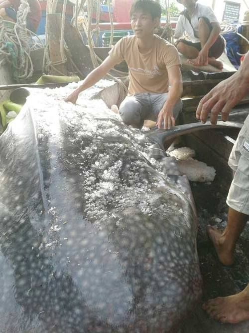 Con cá voi này có chiều dài 6m, vòng bụng 3,5m, ước nặng khoảng 4 tấn. Đây là loài cá nhám voi thuộc loại quý hiếm.