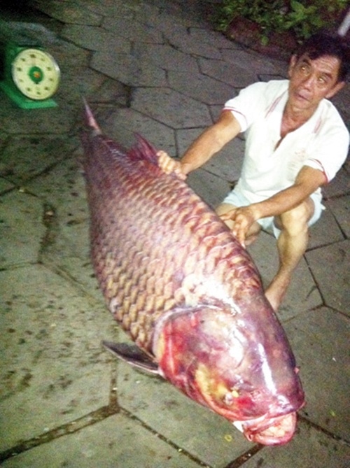 | Con cá rồng nặng 70 kg ở An Giang khiến người dân sửng sốt. |