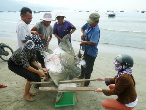 Sáng ngày 5/3, hàng trăm người dân thành phố Quy Nhơn, Bình Định tập trung về khu vực bãi Xép (phường Ghềnh Ráng) để xem con cá khổng lồ, nặng khoảng 500 kg, vừa được đưa vào bờ. Chủ nhân của con cá này là ông Trần Văn Đực (ở xã Xuân Phương, thị xã Sông Cầu, tỉnh Phú Yên).