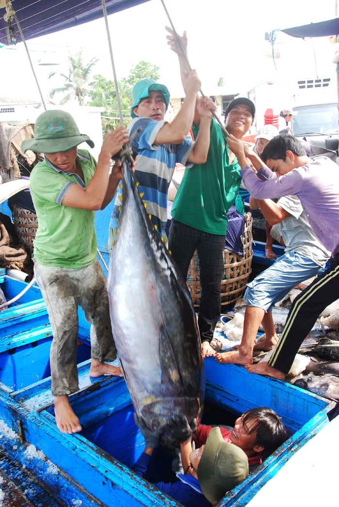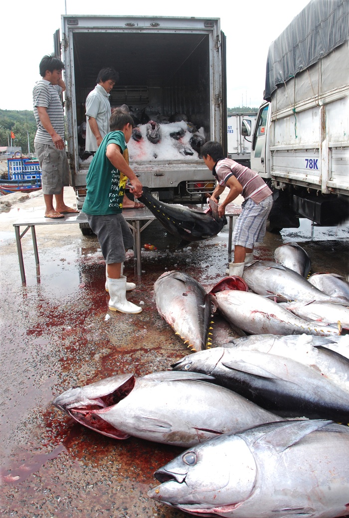 song Phú Yên vẫn là tỉnh có sản lượng khai thác lớn nhất. Gần đây đã có doanh nghiệp nước ngoài đến Phú Yên đặt vấn đề liên kết để khai thác, chế biến cá ngừ xuất khẩu với quy mô lớn.Trong ảnh: Công nhân sơ chế cá ngay tại bến trước khi cấp đông.