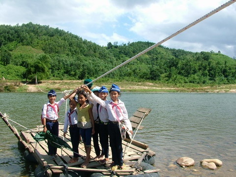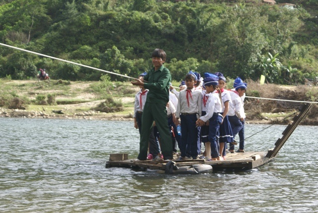 | Tất cả bao gồm 141 trẻ em ở trường tiểu học Sơn Ba (Quảng Ngãi) và 12 giáo viên ngày nào cũng phải vượt qua sông Re bằng bè kéo dây thừng đầy nguy hiểm. (Ảnh: Báo Quảng Ngãi). |