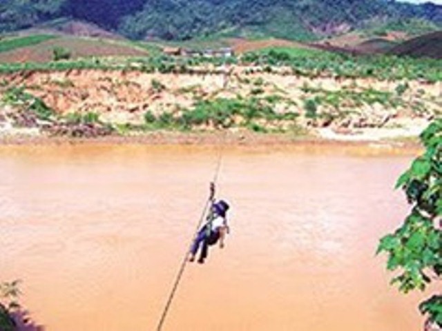 | Năm 2010, sự việc học sinh đu dây cáp vượt sông Pô Kô, cao cách mặt nước khoảng 20 mét, dài 150 mét để sang vùng sản xuất thuộc tiểu khu 154, xã Đak Ang (huyện Ngọc Hồi) thu hút sự quan tâm của dư luận. Trong ảnh là em Trần Thị Anh Tuyết một mình đu dây đến trường, đầy nguy hiểm. (Ảnh: Tuổi Trẻ). |
