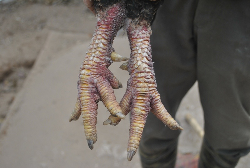| Cận cảnh đôi chân “khổng lồ” của gà Móng, to gấp nhiều lần so với giống gà thường. |
