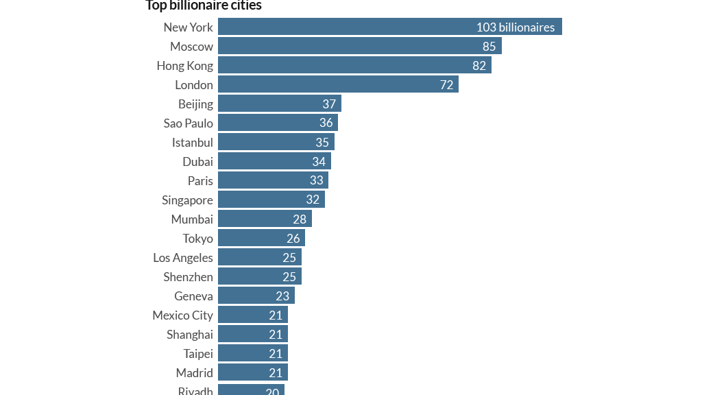 Vậy họ sống ở đâu? Gần 35% các tỷ phú sống tập trung ở 20 thành phố, trong số đó chỉ có 2 thành phố của Mỹ. Tuy vậy, Mỹ vẫn là quốc gia sở hữu số lượng tỷ phú lớn nhất, với gần 25% số tỷ phú toàn cầu.