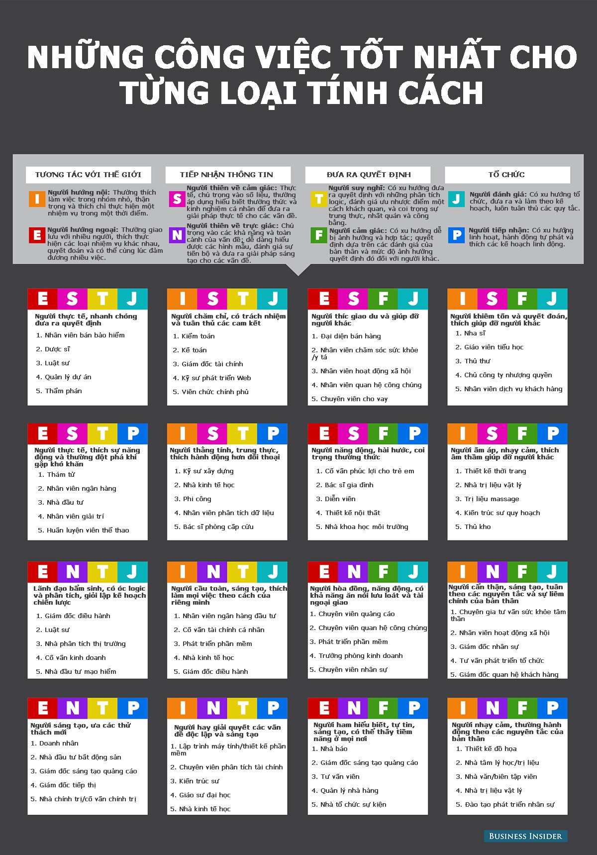 Dưới đây là các công việc phù hợp nhất cho từng loại tính cách theo phân bài kiểm tra Myers-Briggs do trang Business Insider đưa ra.