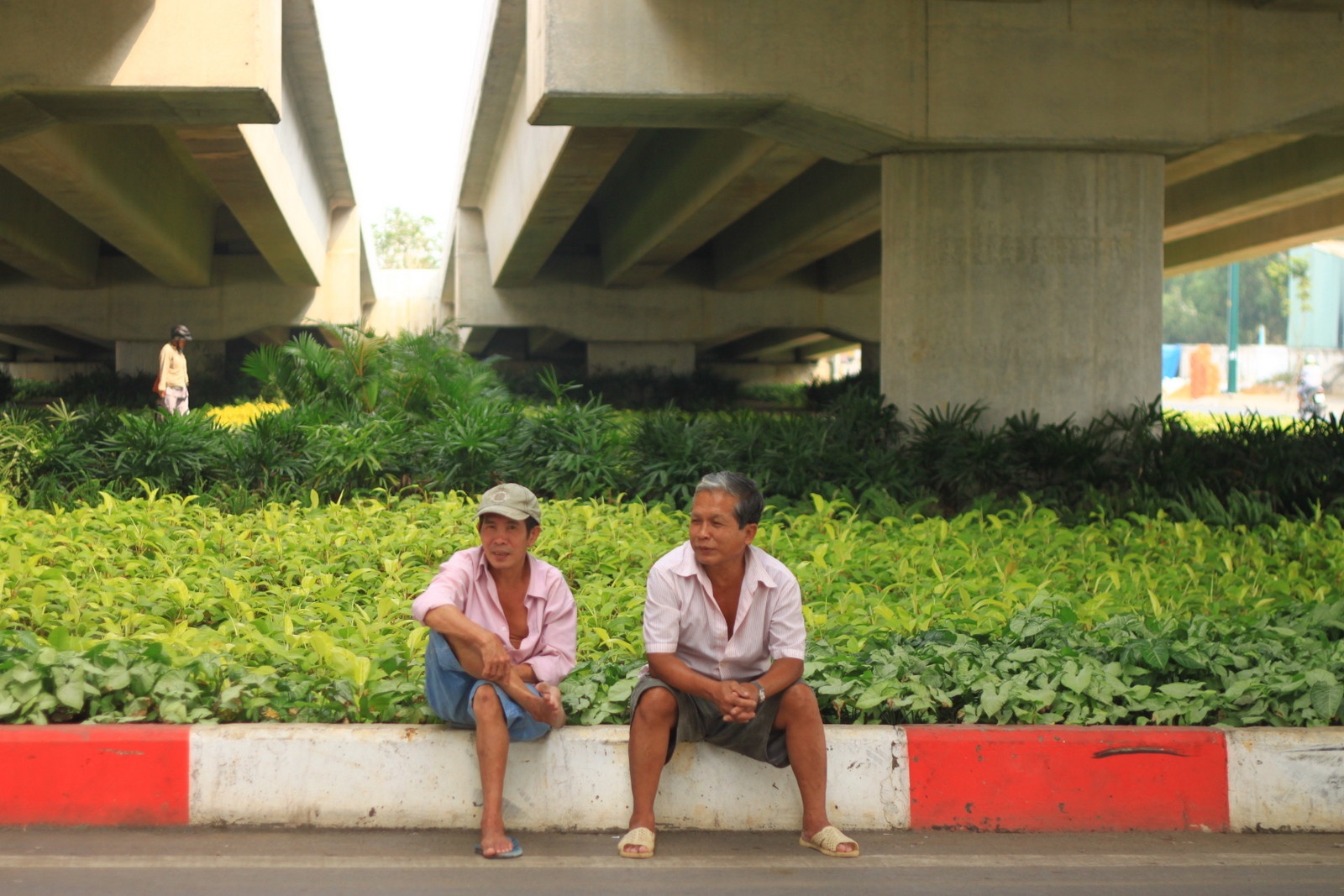 Hai người đàn ông hóng gió dưới dạ cầu vượt ngã tư Bình Triệu.