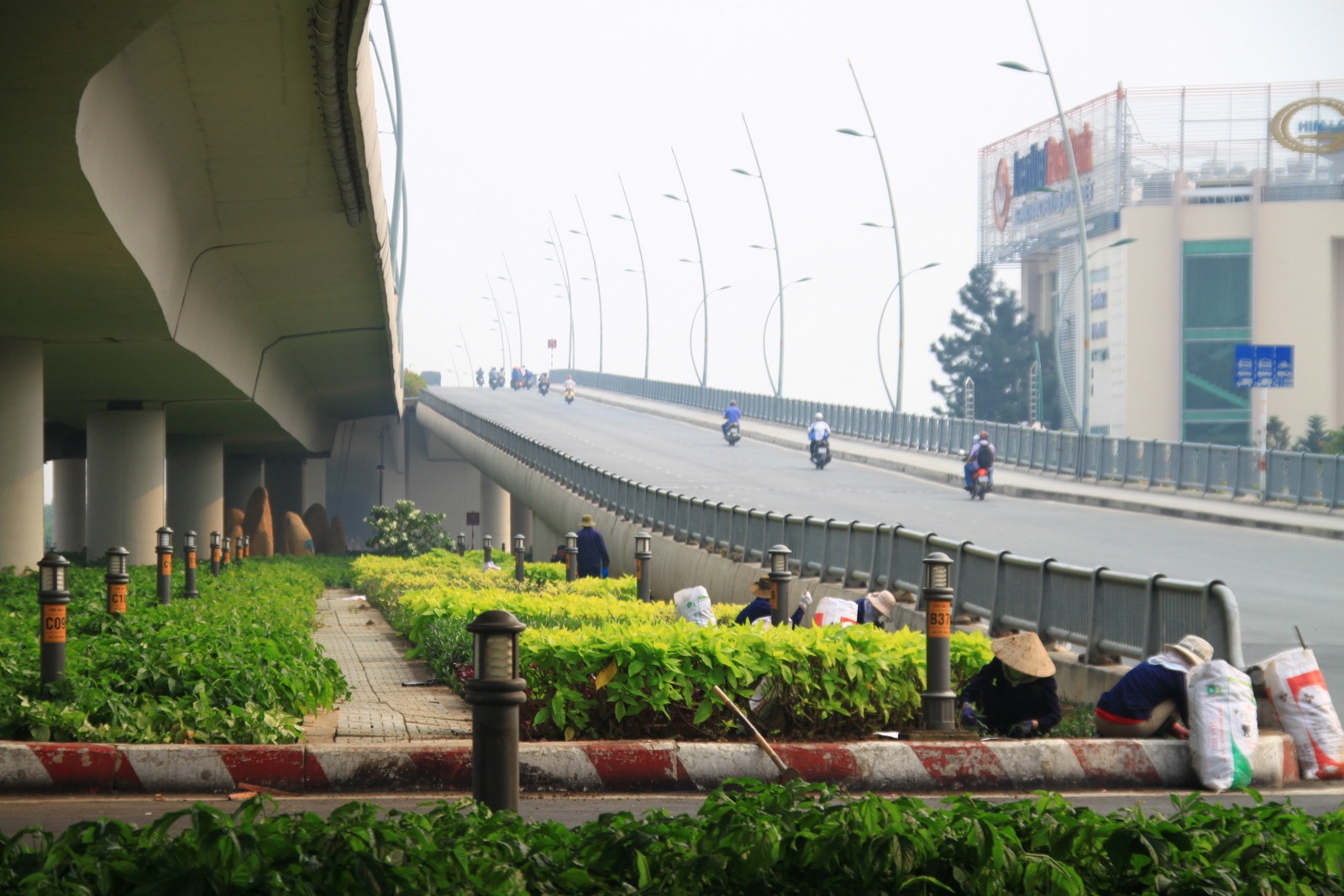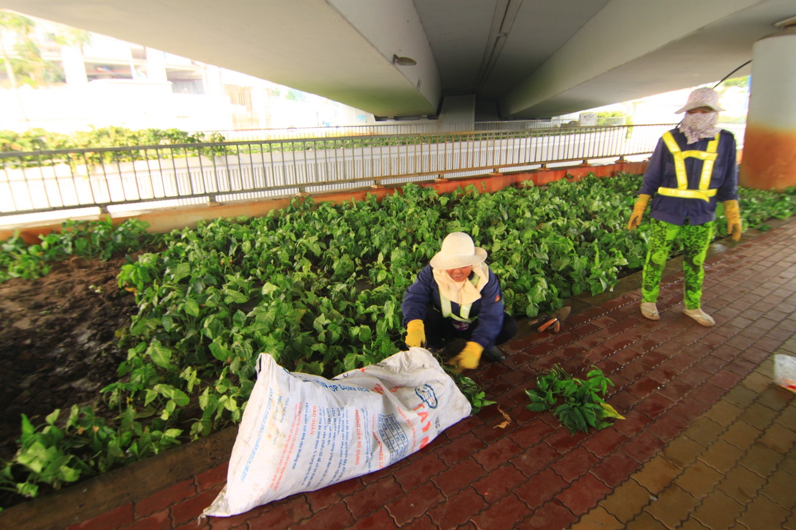 | Công nhân trồng thêm cây dưới dạ cầu Khánh Hội. |