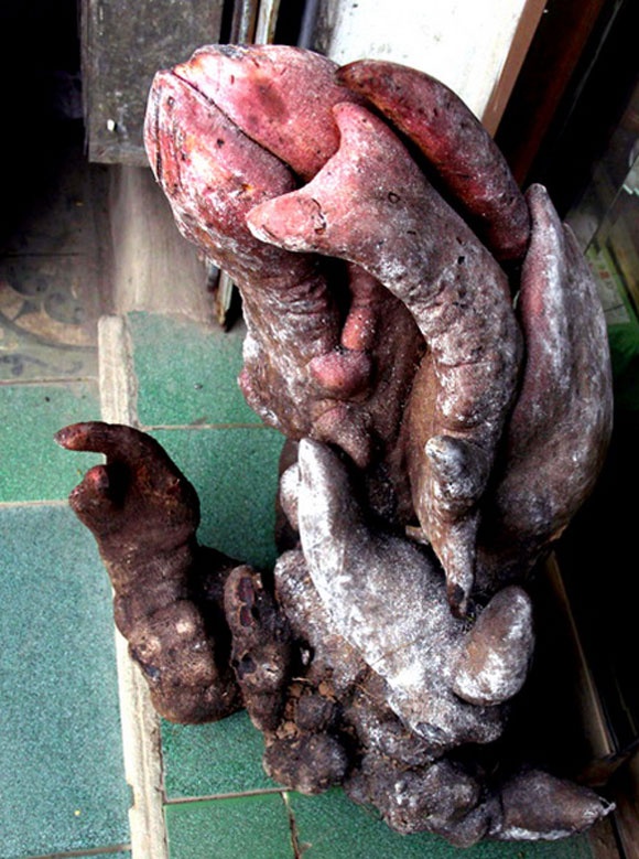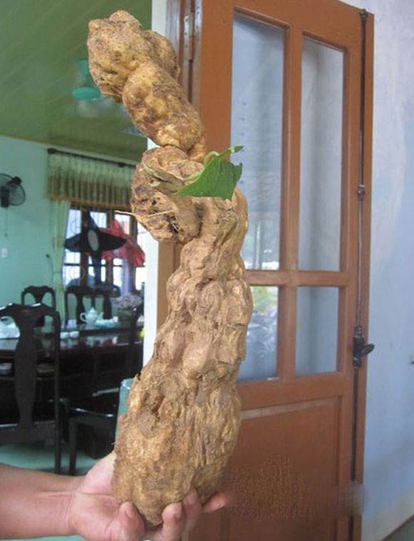 Mới đây, nhân viên của một nhà hàng ở TP. Đồng Hới, Quảng Bình) đã đào được một củ khoai lang có hình thù hết sức đặc biệt, có chiều dài lên tới chiều dài 52cm, đường kính 32cm.