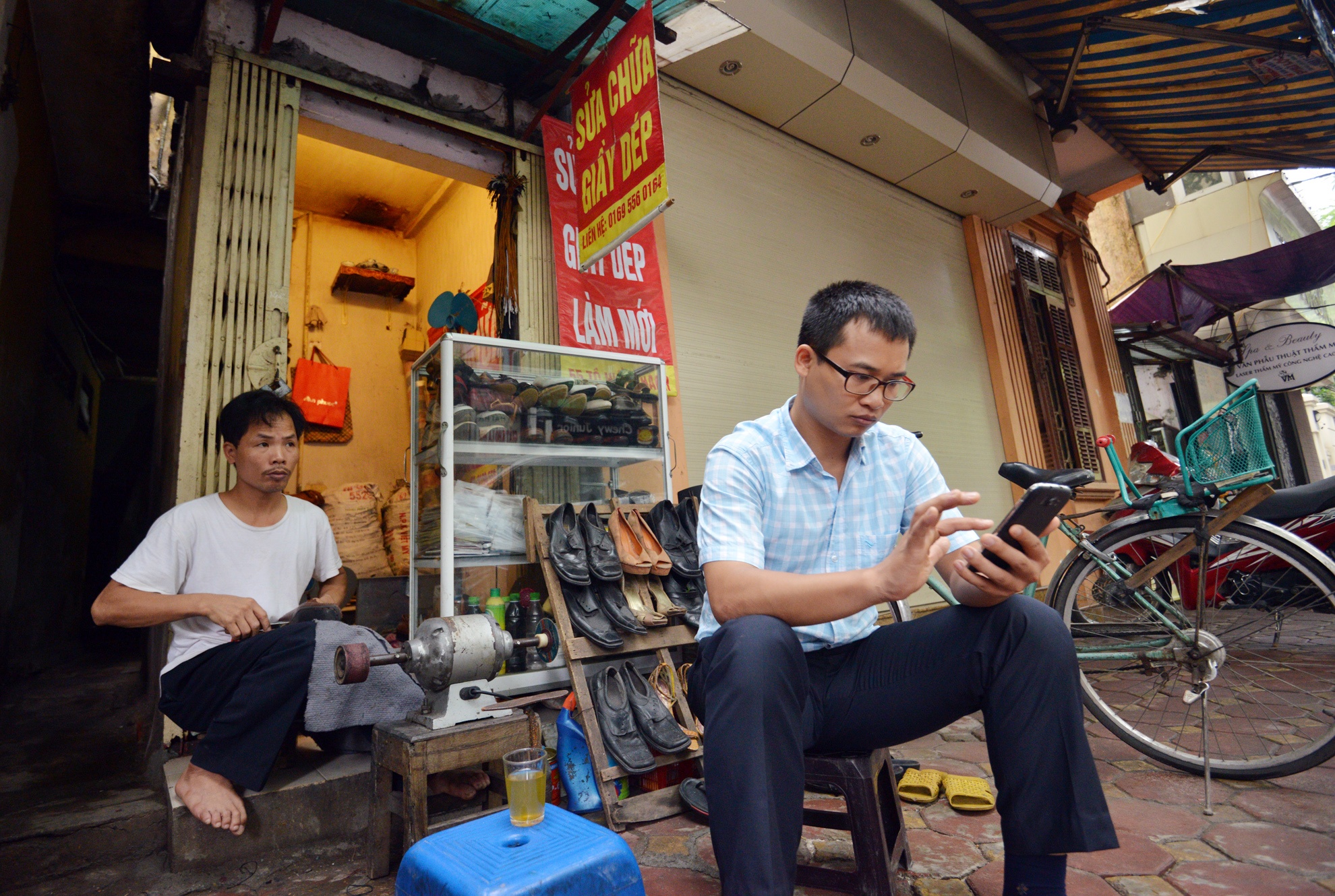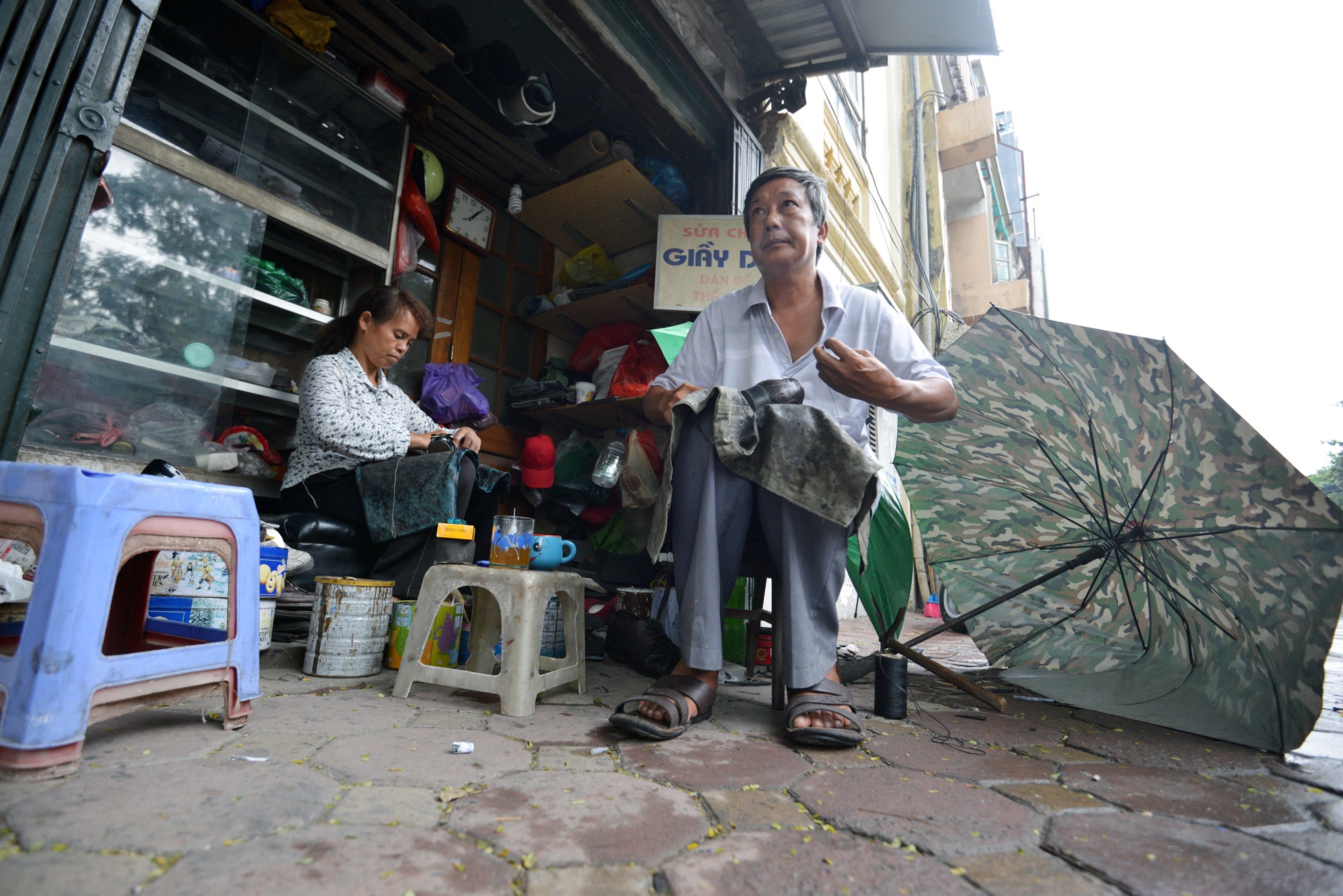 | Cửa hàng sửa giầy dép rộng 2 m2 của một đôi vợ chồng quê Nam Định trên đường Nguyễn Thái Học (quận Ba Đình) có giá thuê 3 triệu đồng/tháng. |